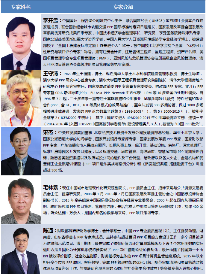 一、基礎設施和社會事業投資建設領域采用PPP模式,既能體現發揮市場配置資源的決定性作用,同時又能體現更好地發揮政府作用,是我國推進公共服務供給側結構性改革的重要舉措,對于理順政府與市場關系,加快政府職能轉變具有特殊重大意義,代表著我國基礎設施投融資建設領域體制機制深化改革的重要方向,受到黨中央、國務院、各級政府、金融機構及各類企業的高度關注,并在我國掀起了推廣應用PPP模式的高潮。 二、由于我國PPP制度頂層設計不完善、投融資體制改革不到位、政府職能轉變滯后、社會資本投資權益保障制度缺失、政策及法律體系不完善、部門之間缺乏統一有效的協調機制、項目參與各方信用履約機制不健全、專業咨詢服務能力不足等原因,使得我國PPP模式的推廣應用產生各種潛在問題及風險隱患,引起社會各界高度關注。 三、正確理解PPP模式的核心理念,規范PPP項目的操作流程,加強PPP投資的戰略管理,提高PPP項目財務分析、融資方案策劃及實施方案的編制質量,加強PPP項目的績效評價,做好爭議解決及風險管控的應急預案,全面提升PPP項目前期論證及實施質量,迫切需要系統更新PPP項目參與各方的知識結構、強化專業能力建設,打造一批掌握扎實基礎理論、專業技能及實操經驗的PPP高級專業人才。 四、我國眾多機構過去三年來開展的大量PPP培訓,難以滿足當前PPP項目運作的實際需要。國家發展改革委組織清華大學PPP研究中心及中國經濟導報社等機構開展的PPP全國巡講,對于正確理解PPP的基本理念、政策法規、操作流程、合同體系、融資操作等發揮了積極作用,極大地激發了全國各地廣大學員在此基礎上更加系統、深入地學習掌握PPP操作專業技能的巨大熱情。為了更好地滿足社會各界的迫切需要,中國國際工程咨詢公司專業團隊決定在總結以往PPP培訓經驗教訓的基礎上,策劃推出“中咨PPP高級人才研修班”全新PPP高端培訓品牌,為促進PPP模式在中國的健康發展貢獻力量。
