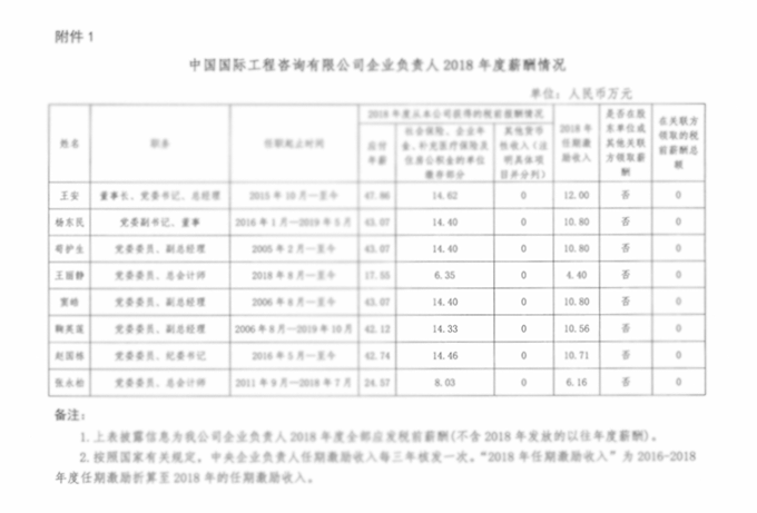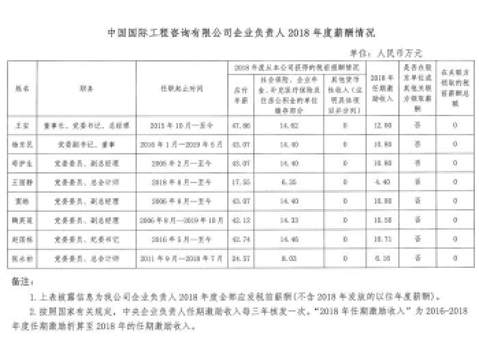 中國國際工程咨詢有限公司企業負責人2018年度薪酬情況披露