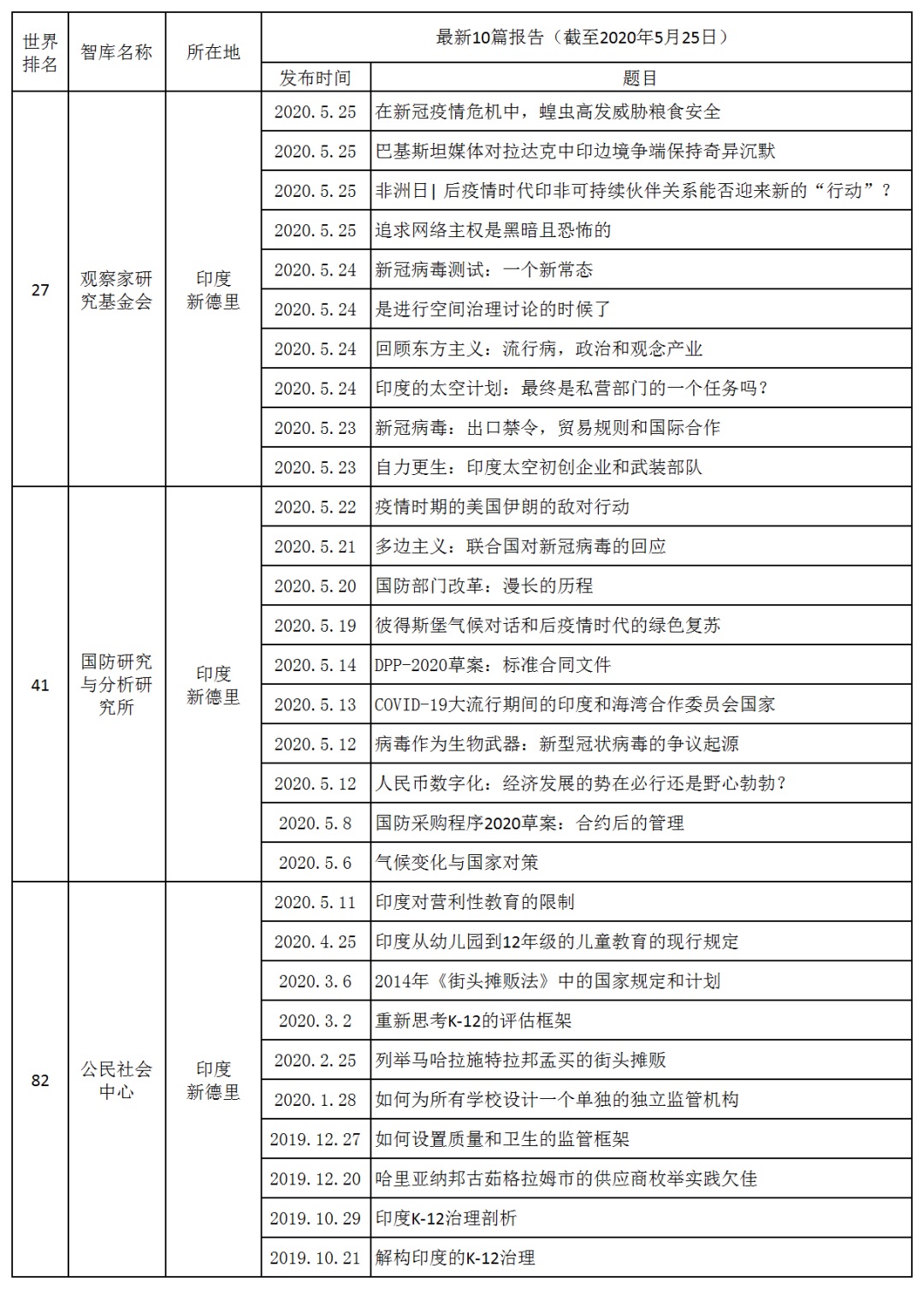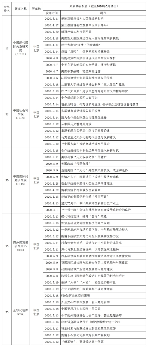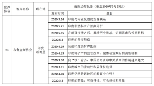 當今世界處于百年未有之大變局,智庫作為連接專業智慧與公共政策的橋梁,已成為國家治理和全球治理的重要支撐。對比我國和美、英、印等國智庫發展情況,可以發現我國智庫主題式研究和階段化研究明顯,持續跟蹤型研究少、系統化研究少。未來我國國家治理體系可能逐步邁入“政、智”一體化的治理新模式,伴隨我國國際地位和國際話語權的提升,建議我國智庫借鑒國際頂級智庫成果形成經驗,在發展規劃層面和研究站位層面能夠與時俱進,抓住跳躍式發展契機,實現我國智庫在全球區位的高質量發展。 一 智庫的內涵及其在政府決策中的地位 (一)智庫的內涵 智庫(Think Tank),顧名思義,是智慧力量、智慧資源的集結。在現代社會,智庫是決策者及決策機構的智囊團和思想庫。美國外交關系委員會主席理查德?哈斯將智庫的職能概括為五個方面:生產理念(Idea Factory)、供給人才(Providing Talent)、謀求共識(Convening Professionals)、教育公眾(Engaging the Public)和充當政府外交的“第二渠道”(Bridging Differences)。 影響力是智庫的生命力之所在,是智庫賴以生存和發展的核心競爭力。智庫一般以政策研究為內核,通過內部或公開渠道,為政府提供政治、經濟、社會、科學、技術等多領域專業咨詢建議,產生影響力。作為獨立于政府之外的第三方機構,智庫具備的政治職能和政治影響力成為智庫立身之本,也是智庫發展的最終目的。 (二)智庫在政府決策中的地位 二十一世紀以來,金融危機、自然災害、糧食危機、軍事沖突、貿易爭端、新冠疫情等全球性治理難題頻發。不論從短期還是從長期來看,世界權力結構、經濟結構、社會結構均在發生劇烈變化,全球化發展的多樣性、復雜性和不確定性不斷增加,倒逼整個政治系統迅速推進國家治理體系及治理能力現代化、法制化、專業化。在此改革進程之中,參政、議政、輔政、問政等政治活動儼然已與智庫的智力支持密不可分。 世界上最主要的社會性權力有五種:政權、法權、財權、智權和德權。政權和法權是國家和政治所賦予的,財權是市場與資本所賦予的,智權取決于科學(包括自然科學和社會科學)、學術制度和社會理性,德權則取決于社會結構、道德崇敬和社會感性。其中,政權擁有者是政府與官員,屬于政治系統;智權擁有者的典型代表是智庫與專家,屬于知識系統。 由于政治系統本身并不具備知識系統的專業技術儲備,因而政治系統的決策者需要配備知識系統的知識生產者作為外援。 一方面,智庫打破了政權和智權、政治系統和知識系統之間的藩籬,以智庫為橋梁,使得決策變成更為理性的行為,由政府官員與專家學者共同完成。實現政治理性與技術理性的完美契合,使得“政”與“智”的聯系以及“治理”能力與“智力”能力的結合愈加緊密,國家治理體系逐步邁入“政、智”一體化的治理新模式。縱觀世界各國現代化發展歷程,智庫在國家治理中一直發揮重要作用,并日益成為國家治理體系不可或缺的組成部分。 另一方面,智權的出現,實質上推動了決策與執行的分離,是一種對政權的“改革”。在政策制定、執行、監督整個過程中,政與智的結合并不拘泥于以官為主,以專家為輔,有時甚至以專家為主,官員為輔。例如,在2020年初發生的新冠疫情“戰役”時期,大部分決策是由衛生防疫和權威的醫學專家做出的,在這種特殊時期,專家的權威會被無形放大,成為政策制定的指引和導向。 二 全球智庫發展概況及其最新成果特點 (一)全球智庫總量近年增長情況 美國賓夕法尼亞大學智庫與公民社會項目組(TTCSP)編寫的《全球智庫報告》(Global Go To Think Tank Index Report),雖然評價方法和結果存在爭議,但一直被認為是最權威的全球智庫發展報告。根據2020年1月發布的《全球智庫報告2019》,對比2015至2019年發布的報告,全球智庫2014年至2019年的排名發生了較大變動,如表1所示。 由美國賓夕法尼亞大學智庫與公民社會項目組(TTCSP)編寫的年度《全球智庫報告》雖然在評價方法和結果上越來越產生爭議,但根據項目組對全球智庫機構建立的索引來看,全球智庫2008年是5465家,2019年是8248家,正在快速增長,智庫不僅在發達國家已為數眾多,而且在發展中國家也與日俱增。 表1 全球主要國家智庫數量近年變化情況 來源:《全球智庫報告》2014-2019。 從表1可以看出: 2014年至2017年,美國、中國、英國的智庫數量一致保持在全球前三。期間,美國智庫總量增長42家,增長率達到2.3%;中國增長83家,增長19.3%;英國增長157家,增長率高達54.7%。 2018年至2019年間,美國智庫總量沒有變動,中國智庫總量減少5家,英國減少123家。2018年,印度智庫異軍突起,總量增長73.7%,由293家增長到509家,超過中國和英國,躍居全球第二。2018年,阿根廷、俄羅斯的智庫總量也保持較快增長,增長率分別達到55.5%、108.7%。 (二)美國頂尖智庫及其研究成果 1.美國的全球智庫排名情況 作為全球智庫數量最多的國家,全球排名前十的智庫,美國常年占據5-6個席位,但具體智庫機構名稱及其排序也在變化。 2014年美國進入全球智庫排名前十共6家,分別是布魯金斯學會(第1名)、卡內基和平基金會(第3名)、國際戰略研究中心(第4名)、蘭德公司(第7名)、外交關系學會(第8名)、伍德羅·威爾遜國際學者中心(第10名)。 在2019年,美國進入全球智庫排名前十共5家,分別是卡內基和平基金會(第1名)、國際戰略