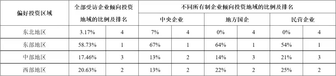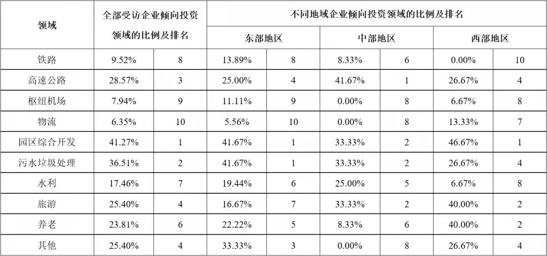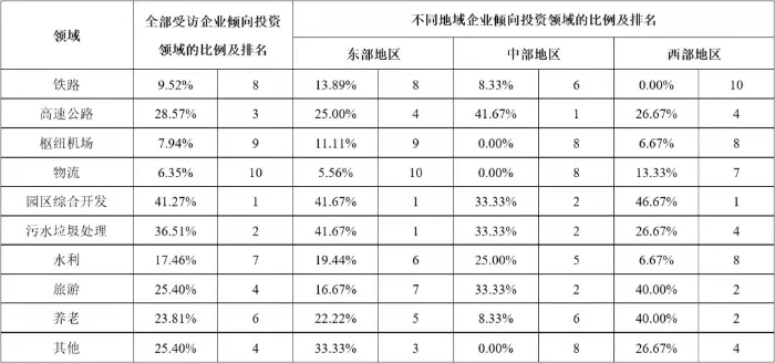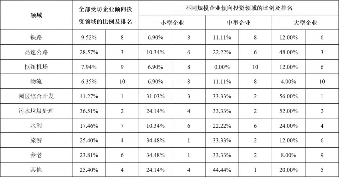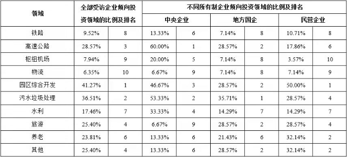 以凱恩斯為代表的傳統(tǒng)西方經(jīng)濟學家,一直以來都強調(diào)政府在基礎(chǔ)設(shè)施建設(shè)供給中的重要地位。但隨著各國民間資本的發(fā)展以及基礎(chǔ)設(shè)施建設(shè)需求的不斷增加,基礎(chǔ)設(shè)施完全由政府供給的傳統(tǒng)理論受到挑戰(zhàn)。引入社會資本參與我國基礎(chǔ)設(shè)施領(lǐng)域的投資建設(shè),是我國40年投融資體制改革與創(chuàng)新歷程中的重要成果,為新時代基礎(chǔ)設(shè)施高質(zhì)量發(fā)展、促進有效投資做出了重要貢獻,也為世界基礎(chǔ)設(shè)施建設(shè)供給的理論與實踐講述了中國故事。 公司研究中心在多年相關(guān)專題研究與專項評估工作的基礎(chǔ)上,在有關(guān)各方的支持下,成立了以伍迪、牛耘詩、張雪飛、苗雨菲、馮珂、蘇靖丹、陳海清、周秘等內(nèi)外部青年專家為骨干的“民間資本投資基礎(chǔ)設(shè)施”專題研究小組,自2019年起在各級政府部門、工程企業(yè)、學術(shù)團體、咨詢單位、金融機構(gòu)等實施了多輪專項調(diào)研,先后獲得了168份調(diào)研數(shù)據(jù)資料,并基于調(diào)研數(shù)據(jù)對投資環(huán)境、投資偏好、資本結(jié)構(gòu)、制約因素、政策有效性等多個方面開展了研究。本公眾號將部分研究成果以系列文章的形式陸續(xù)刊發(fā),本文為系列研究之一,供業(yè)界同仁參考。 不同類型企業(yè)投資基礎(chǔ)設(shè)施項目的偏好差異研究 摘要:企業(yè)參與投資能夠促進我國基礎(chǔ)設(shè)施發(fā)展。基于調(diào)研數(shù)據(jù),從領(lǐng)域和區(qū)域兩方面,對我國不同類型企業(yè)投資基礎(chǔ)設(shè)施項目的偏好差異進行對比分析,發(fā)現(xiàn)企業(yè)的所有制類型、主營業(yè)務所在地、企業(yè)規(guī)模等方面對企業(yè)的投資偏好產(chǎn)生影響,總結(jié)不同類型企業(yè)的投資偏好特點,分析偏好產(chǎn)生差異的深層原因,并給出政策建議。 關(guān)鍵詞:基礎(chǔ)設(shè)施;企業(yè)類型;投資偏好;補短板 一、研究背景 改革開放以來,我國全社會固定資產(chǎn)投資保持高速增長,1982年至2018年間平均增長率為20.4%。基礎(chǔ)設(shè)施是社會生產(chǎn)和居民生活提供公共服務的物質(zhì)工程設(shè)施,是全社會固定資產(chǎn)投資的重要組成部分,是實現(xiàn)經(jīng)濟快速持續(xù)增長的重要推動力。但是2018年以來,我國基礎(chǔ)設(shè)施投資連續(xù)兩年增長率僅為3.8%,內(nèi)外部環(huán)境的變化為基礎(chǔ)設(shè)施領(lǐng)域投資建設(shè)帶來新的挑戰(zhàn)。 企業(yè)參與基礎(chǔ)設(shè)施投資,既能緩解政府資金壓力,又能通過市場化方式引入專業(yè)化的建設(shè)、運營和管理經(jīng)驗,能夠有效拓展建設(shè)項目范圍,打破行業(yè)壟斷機制,對促進基礎(chǔ)設(shè)施高質(zhì)量發(fā)展、國民經(jīng)濟健康穩(wěn)定增長具有重要意義。 我國實行以公有制為主體、多種所有制經(jīng)濟共同發(fā)展的基本經(jīng)濟制度,各種類型的企業(yè)都可以平等地參與基礎(chǔ)設(shè)施項目。但是,不同類型的企業(yè)對基礎(chǔ)設(shè)施項目存在不同的投資偏好,這種偏好的差異體現(xiàn)在行業(yè)領(lǐng)域、空間區(qū)域等方面,產(chǎn)生這些差異的原因除了企業(yè)的所有制屬性不同,還包括企業(yè)的規(guī)模、企業(yè)所在地等因素。因此,本研究對不同類型的企業(yè)進行行業(yè)領(lǐng)域和空間區(qū)域方面投資偏好的調(diào)研,并對不同投資偏好的差異進行分析,為促進企業(yè)參與基礎(chǔ)設(shè)施領(lǐng)域的有效投資以及相關(guān)政策的制定提供借鑒。 二、調(diào)研設(shè)計與實施 基于研究目標,本次調(diào)研重點調(diào)查企業(yè)的類型特征和投資偏好兩部分內(nèi)容:企業(yè)的類型是企業(yè)的客觀信息,包括企業(yè)的所有制屬性、企業(yè)規(guī)模、所在區(qū)域等;企業(yè)的投資偏好則是企業(yè)基于自身狀況的戰(zhàn)略定位,包括行業(yè)領(lǐng)域、區(qū)域等投資偏好,具有一定的主觀性,因此要求調(diào)研的受訪對象一定是充分了解所在企業(yè)戰(zhàn)略和投資情況等的中高層管理人員。 本文研究團隊于2019年11月至2020年2月期間參與某中央預算內(nèi)資金的專項工作,通過全國各級政府投資主管部門邀請到來自63家企業(yè)的管理人員參與本次調(diào)研。這些企業(yè)的所有制類型、主營業(yè)務所在地、企業(yè)規(guī)模分布如圖1、圖2、圖3所示,可以看出,本次調(diào)研的受訪企業(yè)具有較強的多樣性,在不同類型特征中的分布滿足本文研究要求。 三、投資領(lǐng)域偏好的調(diào)研結(jié)果與分析 為了提升研究的實踐指導意義,本次調(diào)研對各受訪企業(yè)的投資領(lǐng)域選擇范圍進行了明確的限定,即在2018年國務院發(fā)布的《關(guān)于保持基礎(chǔ)設(shè)施領(lǐng)域補短板力度的指導意見》中提到的“補短板”領(lǐng)域中進行選擇,具體細分為鐵路、高速公路、樞紐機場、物流、園區(qū)綜合開發(fā)、污水垃圾處理、水利、旅游、養(yǎng)老及其他等多個領(lǐng)域,調(diào)研中邀請受訪企業(yè)選擇不多于三個本企業(yè)傾向投資的領(lǐng)域。 調(diào)研結(jié)果顯示,企業(yè)投資領(lǐng)域偏好中最高的三個領(lǐng)域是園區(qū)綜合開發(fā)、污水