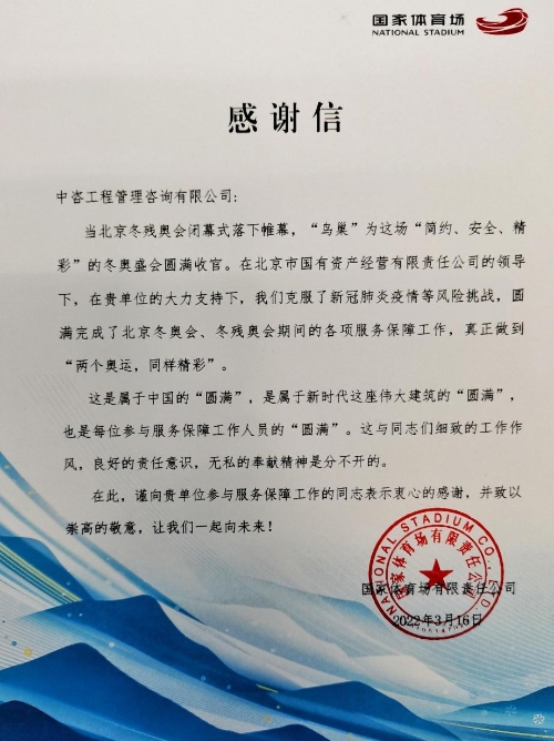 最美人間四月天,桃李芬芳各爭先。 2022年4月8日上午,北京冬奧會、冬殘奧會總結表彰大會在人民大會堂隆重舉行。中共中央總書記、國家主席、中央軍委主席習近平出席大會并發表重要講話。他強調,北京冬奧會、冬殘奧會廣大參與者珍惜偉大時代賦予的機遇,在冬奧申辦、籌辦、舉辦的過程中,共同創造了北京冬奧精神。他號召,要大力弘揚北京冬奧精神,以更加堅定的自信、更加堅決的勇氣,向著實現第二個百年奮斗目標奮勇前進,向著實現中華民族偉大復興的中國夢奮勇前進。 擲地有聲的話語震顫每一位中華兒女的心房! 4月8日,北京冬奧會、冬殘奧會總結表彰大會在人民大會堂隆重舉行 作為參建北京冬奧會的中央企業——中國國際工程咨詢有限公司(簡稱中咨公司)黨委書記、董事長、總經理茍護生十分感慨和榮幸,能夠參加表彰大會,并現場聆聽習近平總書記的重要指示。 中咨公司黨委書記、董事長、總經理茍護生參加北京冬奧會、冬殘奧會總結表彰大會 共同參與,共同盡力。精彩絕倫的北京冬奧會熔鑄了無數參與者的智慧、激情與汗水。 念念不忘,必有回響。置身莊嚴肅穆的人民大會堂,聆聽總書記的殷殷囑托,茍護生董事長表示:“我是代表中咨人來分享這份榮光。參建冬奧,無上光榮。我們將積極響應習近平總書記的號召,發揚北京冬奧精神,用新的奮斗鑄就新的輝煌,用實際行動獻禮黨的二十大和社會主義現代化建設新征程。” 中咨公司黨委書記、董事長、總經理茍護生在北京冬奧會、冬殘奧會總結表彰大會現場 回首來時路,郁郁滿芳華。請和小編一起,走進中咨人與冬奧的“冰雪之約”。 引航:為冬奧氣象、交通保障提供咨詢服務 作為國內規模最大、涉及門類最全的綜合性工程咨詢機構,為國家重大戰略、工程、規劃等提供咨詢服務,是中咨公司的職責所在,也是優勢所在。 2018年1月,中咨公司下屬的中咨海外公司受北京市發展和改革委員會委托,承擔北京冬奧會氣象能力提升和氣象服務保障工程咨詢評估任務,對項目建設的必要性、建設方案可行性及投資合理性等提供專業化建議。 中咨海外公司咨詢團隊在北京延慶國家基本氣象站開展工作 服務“國之大者”,一刻也不能晚,一天也誤不起。 2018年1月12日,中咨海外公司第一時間成立由氣象工程、信息工程和工程造價等方面專家和咨詢骨干組成的“智囊團”,投入項目評估工作。 沒有調查,就沒有發言權。 2018年1月18日,咨詢團隊奔赴分布于北京市海淀區、延慶區的多個氣象服務、保障工程建設點,馬不停蹄開展現場踏勘工作。 在海拔2198.8米的延慶區小海坨山峰頂,咨詢團隊冒嚴寒、越高山,把科學求實的精神寫在皚皚白雪之巔。 中咨海外公司咨詢團隊在海坨山現場踏勘時冒著風雪就餐 掌握第一手資料后,中咨海外公司迅速組織召開項目評估會,邀請北京市發展改革委、北京市氣象局、投資北京國際有限公司、北京北咨信息工程咨詢有限公司等單位領導、專家和代表共同與會,匯眾智、出良策。 與會人員認真聽取項目建設單位和報告編制單位對項目情況的介紹,評估專家組圍繞關鍵問題進行詢問和討論,一條條合理化建議應運而生。 沒有最好,只有更好。 根據評估意見,項目建設單位在與中咨海外公司的多輪溝通中,對項目建議書代可行性研究報告反復進行補充和完善。 2018年6月14日,中咨海外公司對修改后的報告進行再評估,正式出臺項目咨詢評估報告,對氣象信息網絡系統、智慧氣象服務系統、氣象服務保障工程等的內容及規模進行了優化,對工程建設進度、投資成本、資金來源等給出建議,贏得充分認可。 護航冬奧,交通先行。 中咨公司交通業務部還承擔了“北京市軌道交通11號線西段(冬奧支線)”項目評估任務。該線路是連接首鋼滑雪大跳臺的重要軌道交通線路。 中咨團隊盡銳出戰,全力以赴,對項目建設提出專業性、建設性、前瞻性意見建議,大量結論被采納,為北京冬奧交通運輸保障加固“防線”,并進一步優化了北京市軌道交通網絡,造福首都人民。 起航:參建河北崇禮冰雪小鎮 2018年5月,中咨公司下屬的中咨管理公司中標河北崇禮太子城冰雪小鎮工程監理項目。總建筑面積近53萬平方米,包括冬奧組委會接待中心、運營中心,冬奧之家、頒獎廣場、會展中心大廳、多個奧運簽約酒店等“中樞”工程。 河北崇禮太子城冰雪小鎮全貌 塔吊林立,網架飛索。群山環繞,縱橫阡陌。從初春到盛夏,從深秋到寒冬,數十名中咨管理公司監理工程師,駐守現場數百個日日夜夜,以一絲不茍的工匠精神護航冰雪小鎮問世之旅。 中咨管理公司團隊在河北崇禮冰雪小鎮召開監理會議 作為獨立公正的工程管理第三方,中咨管理團隊建立一整套“冬奧”監理規章制度,開展“每日巡檢質檢”和“專項安全質量檢查”,不讓一絲漏洞從眼皮底下溜過;雷打不動召開“每周監理例會”,全程把握安全、質量、進度、投資等關鍵環節;堅持“每月月報”,及時與甲方溝通進展,共同研判形勢,攻克難點堵點;組織“百日沖刺”勞動競賽,讓整個團隊始終“電力滿滿”。 中咨管理團隊在河北崇禮冰雪小鎮項目參加安全月活動 四載寒來暑往,中咨管理團隊圓滿完成崇禮太子城冰雪小鎮建設工程監理任務。先后斬獲“2020年度優秀項目部獎”、“河北省結構優質工程獎”“河北省文明工地”等殊榮,擦亮