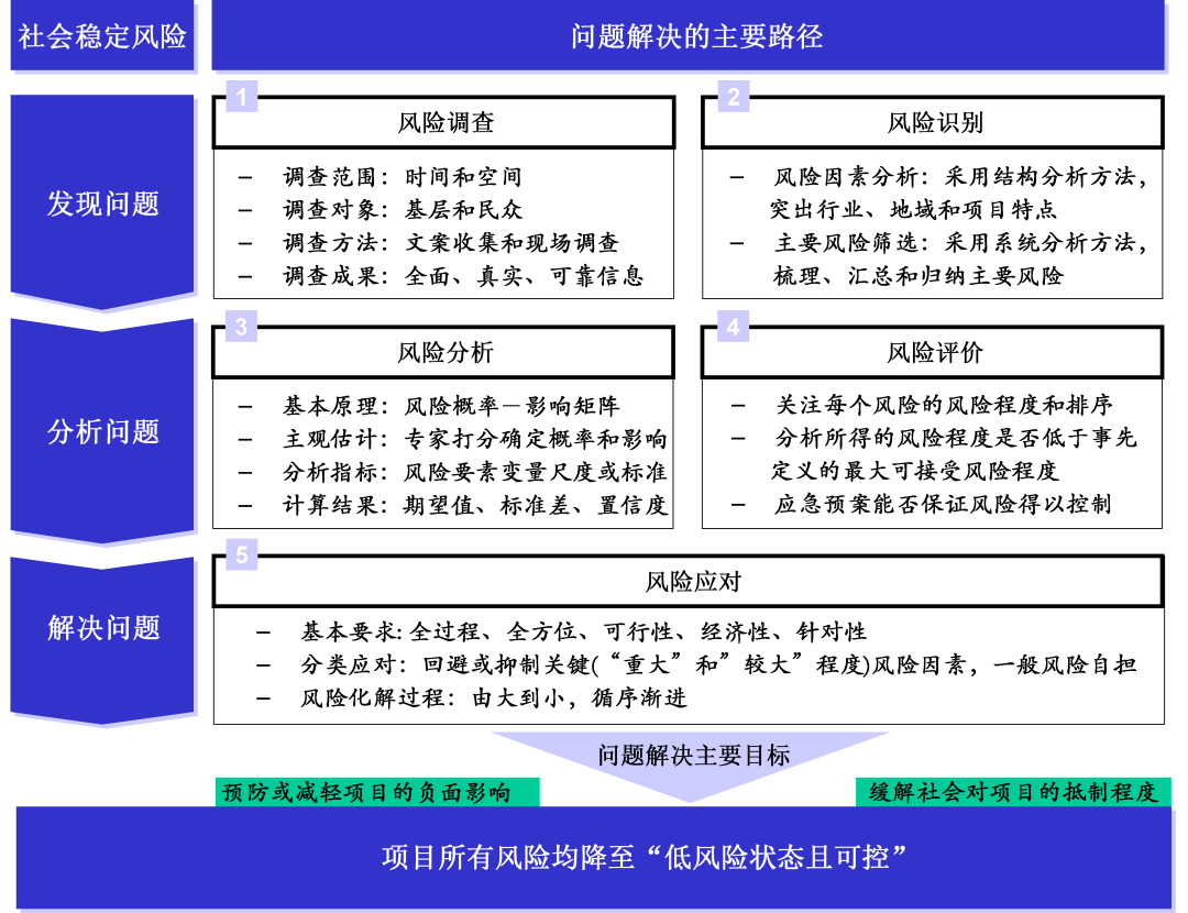 重大項目社會穩定風險評估方法研究 ——“以問題解決為導向”的項目穩評框架的提出 李開孟 徐成彬 彭振武 摘要:本文從社會穩定風險及其評估的基本概念出發,綜述了國內外有關社會穩定風險研究的理論方法和實踐探索,針對“以整體風險等級為導向”的穩評框架在評估方法上存在的缺陷和不足,提出以“發現問題—分析問題—解決問題”為主線的項目社會穩定風險評估新框架。“以問題解決為導向”的新框架思路是:通過全面深入調查,在分析各風險因素的基礎上確定影響社會穩定的主要風險,分析各風險的發生概率和影響程度,對標評判風險程度及可控程度,對不可接受的風險制定切實可行的應對措施,所有風險都處于“低風險且可控”狀態才可得出項目社會穩定風險可接受的評估結論。針對“以問題解決為導向”穩評方法應用,建議全面深入調查發現項目社會穩定風險問題,通過結構分解與系統集成進行風險識別,基于概率—影響矩陣的項目風險分析,對標評判風險水平及其可控程度,分類制定切實可行的風險應對措施。 關鍵詞:重大項目;社會穩定風險;評估方法;以問題解決為導向 一、風險社會與社會穩定風險的產生 經過四十多年的改革開放,我國經濟社會發展成就舉世矚目。在經濟發展水平顯著提升的同時,社會問題開始逐步凸顯,這是社會發展的歷史階段所決定的。縱觀西方工業化國家的發展歷程,都曾經歷過類似階段,而且在一些國家的表現更為嚴峻和激烈,如英國工業化過程中的圈地運動。許多西方學者認為,進入現代化的一定階段后,必然伴隨社會風險的增長,并進入風險社會的發展階段,社會風險是社會現代性的基本要素。 20世紀后半期,社會風險逐漸被社會學界所關注,西方許多著名社會學家如烏爾里希·貝克(Ulrich Beck)、安東尼·吉登斯(Anthony Giddens)、尼克拉斯·盧曼(Von Niklas Luhmann)等都對社會風險進行過深入研究,形成了有關風險的社會學理論。其基本假設是:人類正從一個現代化的社會進入一個新型的風險社會。現代化的科學技術發展和工業化推動,使人類進入一個它過去所陌生的世界;現代化邏輯本身所產生的新的社會風險,完全不同于傳統的社會問題、社會矛盾和社會沖突。過去的生活經驗、技術手段和組織制度,已不足以使人類防止、規避和應對新的社會風險的威脅。進入風險社會,是社會發展的現代化水平達到一定階段的產物。德國社會學家烏爾里希·貝克認為,現代性正從古典工業社會的輪廓中脫穎而出,正在形成一種嶄新的形式—工業化時代的“風險社會”。英國社會學家安東尼·吉登斯認為,風險概念標識了現代社會與前現代社會的根本差異。在自然和傳統消亡后生存的世界,其特點是從“外部風險”逐漸向“人造風險”轉移。 我國社會學者也認為,隨著社會的發展,過去對社會安全問題的認識有了新的變化,現代社會開始出現一種新型的社會穩定風險。關于傳統社會安全,從政法工作角度分析可以歸為六種:一是“三股勢力”,暴力恐怖、宗教極端、民族分裂勢力;二是社會黑暗勢力(即黑社會);三是危害社會治安的刑事慣犯;四是販毒集團;五是邪教骨干;六是各種敵對性質的非法社團問題。在傳統的社會安全領域,這六個方面一直是人們關注的焦點。但是,隨著群體性事件的逐步增多,人們逐漸開始意識到現代社會出現了一些新型的社會穩定風險,這些風險廣泛存在于工程建設、金融活動、新型傳染病、恐怖襲擊、網絡病毒、化學物種、生態環境等不同領域。這些新型的社會風險與傳統的社會安全問題相比具有擴散性、不確定性等特點,解決起來也比傳統風險更為復雜。 從社會穩定風險影響社會結構和社會運行的角度出發,可以對“社會穩定風險”作如下分析:①社會現代化進程的快速發展、社會的日益復雜化以及社會能量的空前積累,特別是信息化和全球化過程的不斷發展,給人類社會帶來了很多的不確定性,這種不確定性是前所未有和不斷擴散的。現代化進程的加快為人們提供了很多的機會,但也帶來各類社會穩定風險;②社會穩定風險來自各個方面,包括社會結構的畸形化和各個階層之間利益的沖突所帶來的矛盾、各階層之間貧富差距的不斷擴大、政治體制的不合理和不完備、社會經濟的畸形增長、技術的片面發展和人才的流失和斷層現象及缺少高層次的技術人員、文化的滑坡和文化傳統的不斷流失、環境生態的損害和污染等等;③社會運轉過程中存在的穩定風險一旦演化為突發性事件,在現代社會的基礎上這些突發性事件就會以前所未有的速度和空前的規模擴散到整個社會,甚至有可能會擴散至國際社會這一更大的舞臺之上;④在政治上,因為需要有一套新的思路和方法對現代風險進行管理和控制,使得社會穩定風險對現有的社會制度和社會組織構成很大挑戰,這就要求對政府體制進行重新整合和調整。 基于以上描述可知,社會穩定風險在廣義上是指一種導致社會沖突、危及社會穩定和社會秩序的可能性,是一類基礎性的、深層次的、結構性的潛在危害因素,會對社會的安全運行和健康發展構成嚴重的威脅。一旦這種可能性變成現實性,社會穩定風險就會轉變成公共危機;廣義的社會穩定風險是一個抽象的概念,涵蓋了生態環境領域、政治領域、經濟領域、社會領域和文化領域的各種風險因素。在狹