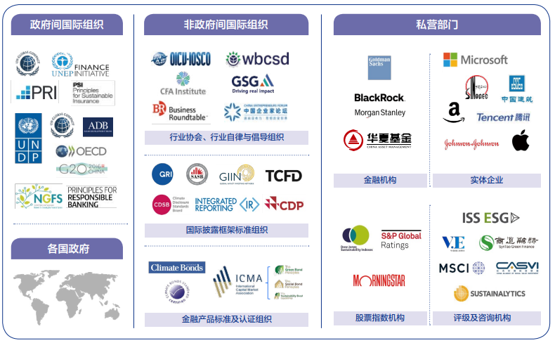 ESG理念和投資原則的迅速傳播和應(yīng)用,關(guān)鍵在于政府間國(guó)際組織、非政府間國(guó)際組織、公共部門和企業(yè)等多元主體共同參與。聯(lián)合國(guó)系統(tǒng)的13家機(jī)構(gòu)或倡議組織(包括UNCTAD、ITC、UNDP、UNEP、WBG、IFC、IMF、UN SSE、UNEP FI、PRI、PSI、PRB、UNGC 等),經(jīng)濟(jì)合作與發(fā)展組織(OECD)、二十國(guó)集團(tuán)(G20)等重要的國(guó)際多邊合作組織,都積極推動(dòng)ESG政策的制定實(shí)行,以亞洲開發(fā)銀行(ADB)為代表的各地區(qū)開發(fā)銀行也紛紛加強(qiáng)對(duì)可持續(xù)領(lǐng)域的項(xiàng)目投資力度,推動(dòng)地區(qū)可持續(xù)發(fā)展目標(biāo)的實(shí)現(xiàn)。在各類國(guó)際組織、政府監(jiān)管部門、金融機(jī)構(gòu)和實(shí)體企業(yè)等共同推動(dòng)下,ESG逐漸走向標(biāo)準(zhǔn)化、國(guó)際化、體系化、全面化,成為了國(guó)際資本市場(chǎng)的一種“新規(guī)則”。