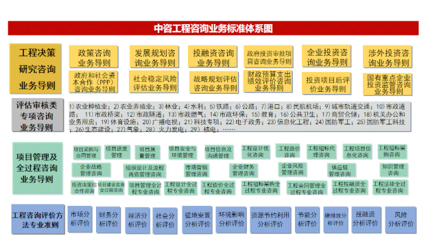 深化工程咨詢理論方法創新研究 構建工程咨詢業務規范標準體系 中國國際工程咨詢有限公司 研究中心黨支部 標準化是國家現代化的重要基石,沒有標準化就沒有現代化,更沒有高質量發展。習近平總書記在中國共產黨第二十次全國代表大會上莊嚴宣告:“從現在起,中國共產黨的中心任務就是團結帶領全國各族人民全面建成社會主義現代化強國、實現第二個百年奮斗目標,以中國式現代化全面推進中華民族偉大復興。”中國式現代化是堅持人民至上、堅持自信自立、堅持守正創新、堅持問題導向、堅持系統觀念、堅持胸懷天下的現代化,是立足新發展階段,完整、準確、全面貫徹新發展理念,構建新發展觀格局,實現高質量發展的現代化,是推進中國標準化事業高質量發展不斷取得新成效的現代化。高質量發展是全面建設社會主義現代化國家的首要任務,也是中咨公司在新時代再出發、再發展、再輝煌的必然要求。一流的企業做標準,二流的企業做品牌,三流的企業做產品。中咨公司按照新時代新要求推動工程咨詢理念創新,打造工程咨詢產業鏈鏈長,創建世界一流咨詢機構,對咨詢業務規范標準體系建設提出了更高要求。根據中咨公司建設國家高端智庫和世界一流咨詢機構戰略規劃目標要求,研究新時代中咨公司如何推動工程咨詢理論方法體系創新,構建符合工程咨詢產業鏈鏈長和世界一流咨詢機構使命要求的工程咨詢業務規范標準體系,是公司結合自身實際深入學習貫徹黨的二十大精神必須深入研究的重大課題。 一、研究制定標準體系是高質量發展的必然要求 (一)標準化是實現經濟社會高質量發展的必然要求 1.高質量發展需要標準化提供支撐 “標準是人類文明進步的成果”。習近平總書記在慶祝第39屆國際標準化組織(ISO)大會召開的賀信中指出:“從中國古代的‘車同軌、書同文’,到現代工業規模化生產,都是標準化的生動實踐。伴隨著經濟全球化深入發展,標準化在便利經貿往來、支撐產業發展、促進科技進步、規范社會治理中的作用日益凸顯。標準已成為世界‘通用語言’。世界需要標準協同發展,標準促進世界互聯互通。” 新中國成立以來,我國標準化事業經歷了從起步探索、開放發展到全面提升的光輝歷程,標準供給更加多元高效,標準體系日趨完善,標準技術水平和國際化程度明顯提升,標準化效益不斷顯現,全社會標準化意識持續增強。與此同時,我國標準化還存在標準有效供給不足、標準實施應用不夠、標準國際化水平亟待提高等問題。在新發展階段,以習近平新時代中國特色社會主義思想為指導,更應深入學習領會習近平總書記“標準助推創新發展,標準引領時代進步”的重要論斷,強調只有高標準才有高質量,沒有高標準就沒有現代化,要將新發展理念貫徹到標準化工作的各個環節和所有方面,充分發揮標準在引領高質量發展和推動實現中國式現代化偉大事業中的重要作用。 2.標準化建設應以高質量發展為目標導向 黨的二十大報告強調在推動中國式現代化建設的偉大事業中,要“加快構建新發展格局,著力推動高質量發展”。在實現高質量發展的具體行動中,無論是完整、準確、全面貫徹新發展理念,還是著力構建高水平社會主義市場經濟體制,建設現代化產業體系,全面推進鄉村振興,促進區域協調發展,推進高水平對外開放,都需要高質量的標準體系來提供支撐保障。習近平總書記強調,“中國將積極實施標準化戰略,以標準助力創新發展、協調發展、綠色發展、開放發展、共享發展”。新時代要更加深刻理解和認識標準化在國家治理體系和治理能力現代化中的基礎性、引領性作用,處理好政府與市場、繼承與創新、國內與國際之間的關系,優化標準化治理結構,增強標準化治理效能,提升標準國際化水平,加快構建推動高質量發展的標準體系,以高標準助力技術創新、促進高水平開放、引領高質量發展,為全面建成社會主義現代化強國、實現中華民族偉大復興的中國夢提供有力支撐。 近年來,以習近平同志為核心的黨中央立足國情、放眼全球、面向未來,對我國標準化事業作出一系列重大部署。我國于2021年制定印發《國家標準化發展綱要》,提出到2025年,我國的標準化工作要更加有效地推動國家綜合競爭力提升,促進經濟社會高質量發展,在構建新發展格局中發揮更大作用,實現全領域標準化深度發展,農業、工業、服務業和社會事業等領域標準全覆蓋;標準化水平大幅提升,標準化的經濟效益、社會效益、質量效益、生態效益充分顯現;標準化開放程度顯著增強,國家標準與國際標準關鍵技術指標的一致性程度大幅提升;標準化發展基礎更加牢固,建成一批國際一流的綜合性、專業性標準化研究機構。到2035年,要實現標準體系更加健全,標準化管理體制更加完善,市場驅動、政府引導、企業為主、社會參與、開放融合的標準化工作格局全面形成。 國家市場監督管理總局等16部門于2022年7月聯合印發《〈國家標準化發展綱要〉行動計劃》(國市監標技發〔2022〕64號),進一步提出要完善現代服務業標準支撐,進一步健全服務業標準化試點示范管理制度,實施標準國際化躍升工程,提升參與國際標準制定和轉化運用的能力水平,加強團體標準規范引導,提升企業標準化能力,探索建立標準創新型企業制度,鼓勵企業構建技術、專利、標
