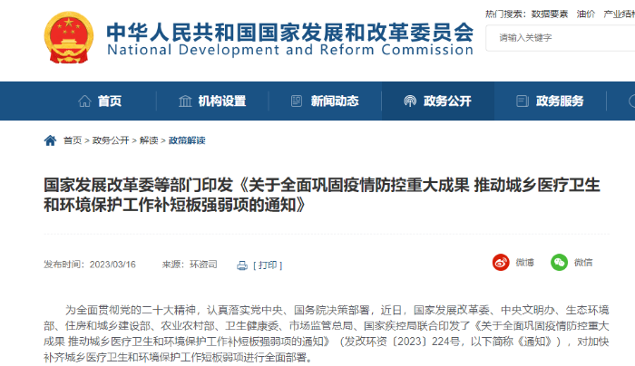 統(tǒng)籌謀劃 重點(diǎn)突破 加快補(bǔ)齊城鄉(xiāng)醫(yī)療衛(wèi)生和環(huán)境保護(hù)短板弱項(xiàng) ——《關(guān)于全面鞏固疫情防控重大成果 推動(dòng)城鄉(xiāng)醫(yī)療衛(wèi)生和環(huán)境保護(hù)工作補(bǔ)短板強(qiáng)弱項(xiàng)的通知》解讀 中國(guó)國(guó)際工程咨詢有限公司 潘小海 全面鞏固疫情防控重大成果,加強(qiáng)醫(yī)療衛(wèi)生和環(huán)境保護(hù)工作是最大程度保護(hù)人民生命安全和身體健康,最大限度減少疫情對(duì)經(jīng)濟(jì)社會(huì)發(fā)展的影響,推動(dòng)經(jīng)濟(jì)平穩(wěn)健康發(fā)展的重要舉措。近日,國(guó)家發(fā)展改革委、中央文明辦、生態(tài)環(huán)境部、住房和城鄉(xiāng)建設(shè)部、農(nóng)業(yè)農(nóng)村部、國(guó)家衛(wèi)生健康委、市場(chǎng)監(jiān)管總局、國(guó)家疾控局聯(lián)合印發(fā)《關(guān)于全面鞏固疫情防控重大成果 推動(dòng)城鄉(xiāng)醫(yī)療衛(wèi)生和環(huán)境保護(hù)工作補(bǔ)短板強(qiáng)弱項(xiàng)的通知》(發(fā)改環(huán)資〔2023〕224號(hào),以下簡(jiǎn)稱《通知》),對(duì)全面鞏固疫情防控重大成果,加快補(bǔ)齊城鄉(xiāng)醫(yī)療衛(wèi)生和環(huán)境保護(hù)短板弱項(xiàng)作出系統(tǒng)部署。《通知》是落實(shí)黨的二十大精神的具體舉措,對(duì)推動(dòng)城鄉(xiāng)醫(yī)療衛(wèi)生和環(huán)境保護(hù)工作取得更大進(jìn)展,加快建設(shè)健康中國(guó)、美麗中國(guó)具有重要意義。 一、充分認(rèn)識(shí)鞏固疫情防控重大成果,加快補(bǔ)齊城鄉(xiāng)醫(yī)療衛(wèi)生和環(huán)境保護(hù)短板弱項(xiàng)的重要意義 (一)充分認(rèn)識(shí)這是做好新階段疫情防控的迫切需要。3年多來,以習(xí)近平同志為核心的黨中央團(tuán)結(jié)帶領(lǐng)全黨全國(guó)各族人民同心抗疫,以強(qiáng)烈的歷史擔(dān)當(dāng)和強(qiáng)大的戰(zhàn)略定力,因時(shí)因勢(shì)優(yōu)化調(diào)整防控政策措施,高效統(tǒng)籌疫情防控和經(jīng)濟(jì)社會(huì)發(fā)展,取得疫情防控重大決定性勝利。當(dāng)前全國(guó)疫情防控形勢(shì)總體向好,平穩(wěn)進(jìn)入“乙類乙管”常態(tài)化防控階段,但全球疫情仍在流行,病毒還在不斷變異,全面鞏固疫情防控重大成果,加強(qiáng)疫情監(jiān)測(cè)和常態(tài)化預(yù)警處置能力建設(shè),加強(qiáng)重點(diǎn)人群健康監(jiān)測(cè)設(shè)施和能力,抓緊補(bǔ)齊重點(diǎn)環(huán)節(jié)防控設(shè)施短板,是新階段抓實(shí)抓細(xì)疫情防控工作的具體舉措,是做好新階段疫情防控工作的迫切需要。 (二)充分認(rèn)識(shí)這是保障人民群眾生命健康的重要舉措。3年以來,在病毒猖獗時(shí)期,我國(guó)頂住了一輪又一輪疫情沖擊,成功避免了致病力較強(qiáng)、致死率較高的病毒株的廣泛流行,最大程度降低了新冠病毒感染造成的重癥率和病亡率,有效保護(hù)了人民群眾生命安全和身體健康。但同時(shí),疫情防控中我國(guó)也暴露出重癥救治壓力大、社區(qū)醫(yī)院分流能力有待加強(qiáng)、重點(diǎn)人群及農(nóng)村地區(qū)救治任務(wù)艱巨等問題。要加快補(bǔ)齊醫(yī)療衛(wèi)生短板弱項(xiàng),建強(qiáng)醫(yī)療衛(wèi)生服務(wù)網(wǎng)絡(luò)設(shè)施,強(qiáng)化醫(yī)療集團(tuán)網(wǎng)絡(luò)化布局管理機(jī)制,加強(qiáng)醫(yī)療物資資源統(tǒng)籌調(diào)配能力建設(shè),做到醫(yī)療衛(wèi)生服務(wù)資源跟得上、機(jī)制可聯(lián)動(dòng),平急結(jié)合、系統(tǒng)高效,切實(shí)維護(hù)人民群眾健康福祉。 (三)充分認(rèn)識(shí)這是共謀綠色生活共建美麗家園的重要途徑。良好生態(tài)環(huán)境是最普惠的民生福祉,是人民群眾迫切需要的公共產(chǎn)品。黨的十八大以來,以習(xí)近平同志為核心的黨中央把生態(tài)文明建設(shè)擺在全局突出位置,開展一系列根本性、開創(chuàng)性、長(zhǎng)遠(yuǎn)性工作,我國(guó)生態(tài)環(huán)境質(zhì)量改善成效顯著,人民群眾獲得感幸福感安全感明顯增強(qiáng)。但同時(shí),我國(guó)生態(tài)環(huán)境保護(hù)結(jié)構(gòu)性、根源性、趨勢(shì)性壓力整體尚未緩解,與人民群眾日常生活息息相關(guān)的城鄉(xiāng)環(huán)境衛(wèi)生、污水垃圾等環(huán)境基礎(chǔ)設(shè)施建設(shè)還存在短板,全社會(huì)綠色健康生活方式尚未廣泛形成。要深入開展愛國(guó)衛(wèi)生運(yùn)動(dòng),補(bǔ)齊人民群眾身邊的污水垃圾等環(huán)境基礎(chǔ)設(shè)施短板,提升全民綠色健康意識(shí),推動(dòng)共謀綠色生活共建美麗家園。 二、準(zhǔn)確把握全面鞏固疫情防控重大成果,加快補(bǔ)齊城鄉(xiāng)醫(yī)療衛(wèi)生和環(huán)境保護(hù)短板弱項(xiàng)的重點(diǎn)任務(wù) 《通知》堅(jiān)持統(tǒng)籌推進(jìn)、重點(diǎn)突破,聚焦我國(guó)疫情防控過程中暴露出的城鄉(xiāng)醫(yī)療衛(wèi)生和環(huán)境保護(hù)工作短板弱項(xiàng),以能力建設(shè)為主線,從堅(jiān)決鞏固住來之不易的疫情防控重大成果、深入開展愛國(guó)衛(wèi)生運(yùn)動(dòng)、加快完善環(huán)境基礎(chǔ)設(shè)施、大力倡導(dǎo)綠色健康生活方式等方面提出12項(xiàng)重點(diǎn)任務(wù),為城鄉(xiāng)醫(yī)療衛(wèi)生和環(huán)境保護(hù)工作補(b
