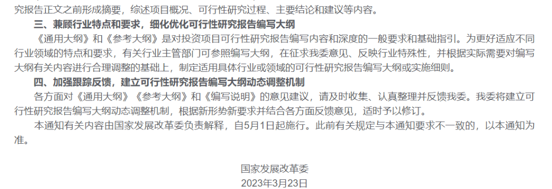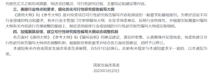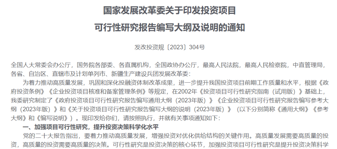 投資項(xiàng)目可行性研究 邁入高質(zhì)量論證新階段 ——解析《投資項(xiàng)目可行性研究報(bào)告編寫大綱》 中國(guó)國(guó)際工程咨詢有限公司 李開孟 徐成彬 高質(zhì)量發(fā)展是中國(guó)式現(xiàn)代化的本質(zhì)要求。高質(zhì)量發(fā)展需要高質(zhì)量的投資,高質(zhì)量的投資需要高質(zhì)量的投資決策,高質(zhì)量的可行性研究是確保投資科學(xué)決策的重要基礎(chǔ)。近日,國(guó)家發(fā)展改革委出臺(tái)《關(guān)于印發(fā)投資項(xiàng)目可行性研究報(bào)告編寫大綱及說(shuō)明的通知》(發(fā)改投資規(guī)〔2023〕304號(hào),點(diǎn)擊閱讀原文),正式發(fā)布《政府投資項(xiàng)目可行性研究報(bào)告編寫通用大綱(2023版)》和《企業(yè)投資項(xiàng)目可行性研究報(bào)告編寫參考大綱(2023版)》(簡(jiǎn)稱《可研大綱》) ,這是繼《投資項(xiàng)目可行性研究指南(試用版)》(簡(jiǎn)稱《可研指南》),時(shí)隔二十年之后國(guó)家投資主管部門發(fā)布的關(guān)于規(guī)范投資項(xiàng)目可行性研究報(bào)告編寫工作的新的綱領(lǐng)性文件,對(duì)于我國(guó)新時(shí)代投資項(xiàng)目科學(xué)決策、推動(dòng)實(shí)現(xiàn)高質(zhì)量投資具有里程碑意義,標(biāo)志著我國(guó)投資項(xiàng)目可行性研究工作將邁入高質(zhì)量論證的新階段。 一、《可研大綱》是投資項(xiàng)目可行性論證的重大飛躍 1.可行性研究伴隨改革開放納入了決策程序并逐步走向規(guī)范 可行性研究作為投資項(xiàng)目科學(xué)決策的一種專業(yè)工具,在世界銀行和聯(lián)合國(guó)工業(yè)發(fā)展組織等國(guó)際機(jī)構(gòu)的推動(dòng)下,20世紀(jì)80年代初隨著改革開放傳入我國(guó),并成為項(xiàng)目投資決策的必經(jīng)程序。2002年1月,國(guó)家發(fā)展計(jì)劃委員會(huì)發(fā)布《關(guān)于出版〈投資項(xiàng)目可行性研究指南(試用版)〉的通知》(計(jì)辦投資〔2002〕15號(hào)),同意出版發(fā)行《可研指南》。《可研指南》系統(tǒng)總結(jié)了我國(guó)改革開放第一個(gè)20年可行性研究工作的經(jīng)驗(yàn)教訓(xùn),成為我國(guó)第一個(gè)在國(guó)家層次上用以指導(dǎo)投資項(xiàng)目可行性研究工作的規(guī)范性文本,標(biāo)志著投資項(xiàng)目可行性研究進(jìn)入規(guī)范化管理階段。 2.《可研大綱》融入了《可研指南》試用經(jīng)驗(yàn)并創(chuàng)新發(fā)展 中國(guó)國(guó)際工程咨詢公司(簡(jiǎn)稱中咨公司)受原國(guó)家計(jì)委委托研究制定的《可研指南》,發(fā)布試用至今已有21年。20多年來(lái),我國(guó)投融資體制和項(xiàng)目管理制度發(fā)生了深刻變化。《可研大綱》的研究起草工作,系統(tǒng)總結(jié)了《可研指南》試用20年積累的經(jīng)驗(yàn),適應(yīng)了投融資體制改革和行政審批制度改革等要求,并立足新發(fā)展階段,采用開放研究方式,不斷創(chuàng)新發(fā)展。研究起草期間,國(guó)家發(fā)展改革委投資司多次召開座談會(huì)和研討會(huì),廣泛征求中央部委、中央企業(yè)、地方政府、金融機(jī)構(gòu)、咨詢?cè)u(píng)估機(jī)構(gòu)等單位的意見,并于2022年11月29日在國(guó)家發(fā)展改革委的官網(wǎng)向社會(huì)公開征求意見,受到了國(guó)內(nèi)外廣泛關(guān)注,先后收到了有關(guān)單位正式提交的1000多條修改完善建議,通過(guò)專家集體討論和逐條消化吸收,遂成終稿。因此,《可研大綱》是集思廣益、群策群力的結(jié)果,是集體智慧的結(jié)晶。 圖1 2023年1月5日,國(guó)家發(fā)展改革委投資司主持召開《可研大綱》專家座談會(huì) 3.《可研大綱》是引領(lǐng)投資項(xiàng)目高質(zhì)量決策的重要遵循 高質(zhì)量發(fā)展是我國(guó)新時(shí)代經(jīng)濟(jì)社會(huì)轉(zhuǎn)型發(fā)展的基本要求,同時(shí)也是我國(guó)投資項(xiàng)目可行性研究工作的核心價(jià)值導(dǎo)向。國(guó)家發(fā)展改革委本次正式印發(fā)的《可研大綱》,包括《政府投資項(xiàng)目可行性研究報(bào)告編制通用大綱(2023年版)》(簡(jiǎn)稱《通用大綱》)和《企業(yè)投資項(xiàng)目可行性研究報(bào)告編制參考大綱(2023年版)》(簡(jiǎn)稱《參考大綱》,不僅體現(xiàn)了最近20年投融資體制深化改革的重要成果,也體現(xiàn)了新時(shí)代高質(zhì)量發(fā)展的理念要求,其推廣應(yīng)用將有利于全面提升我國(guó)投資項(xiàng)目可行性研究的整體水平,有利于發(fā)揮可行性研究對(duì)項(xiàng)目投資科學(xué)決策的關(guān)鍵支撐作用,在擴(kuò)大有效投資、推動(dòng)投資項(xiàng)目高質(zhì)量發(fā)展的實(shí)際工作中發(fā)揮引領(lǐng)作用。 二、《可研大綱》構(gòu)建了統(tǒng)一的可行性研究邏輯框架體系 (一)《可研大綱》要求可行性研究應(yīng)遵循“三大目標(biāo)、七個(gè)維度”總體框架 《可研大綱》將境內(nèi)各行各業(yè)千差萬(wàn)別的可行性研究?jī)?nèi)容進(jìn)行歸納提煉,提出了以“三大目標(biāo)、七個(gè)維度”為核心的可行性研究邏輯框架體系,即投資項(xiàng)目可行性研究應(yīng)圍繞建設(shè)必要性、方案可行性及風(fēng)險(xiǎn)可控性三大目標(biāo)開展系統(tǒng)、專業(yè)、深入論證,重點(diǎn)把握“七個(gè)維度”的研究?jī)?nèi)容。其中,建設(shè