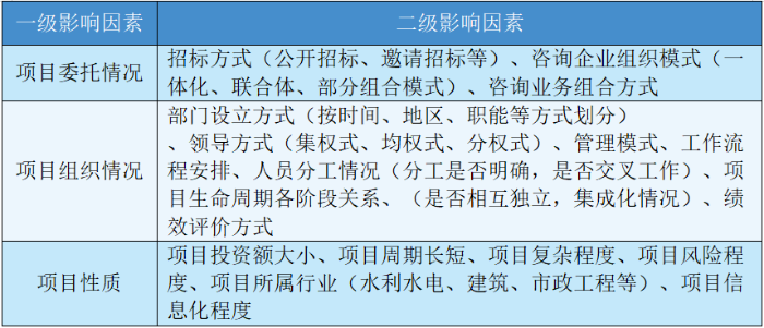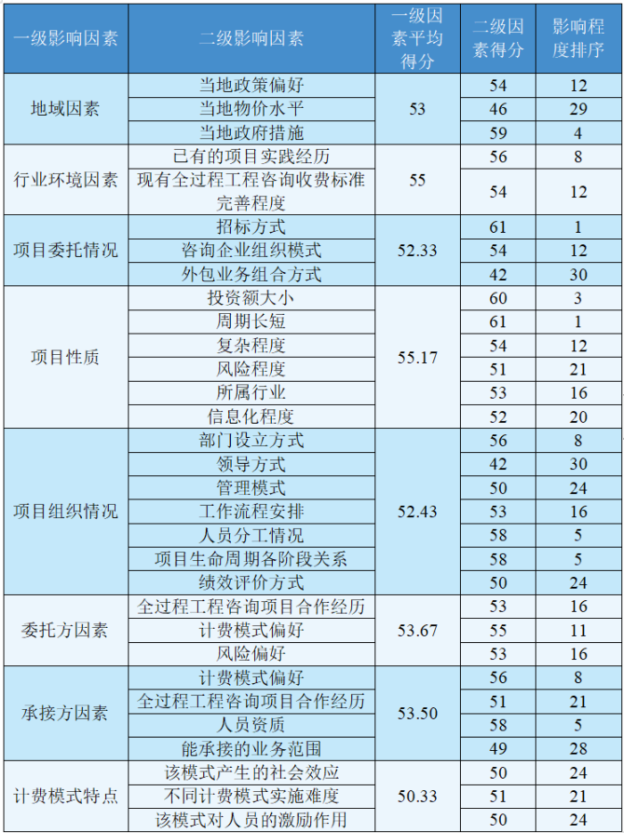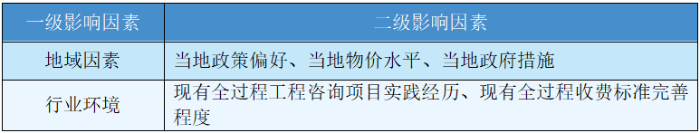 摘要:隨著我國基礎(chǔ)設(shè)施規(guī)模逐漸擴(kuò)大,對(duì)效率要求極高的規(guī)模化、集群化、復(fù)雜化的建設(shè)工程大量出現(xiàn),傳統(tǒng)分階段咨詢模式已經(jīng)不能滿足這類項(xiàng)目的需求,全過程工程咨詢模式開始進(jìn)入人們的視野。我國全過程工程咨詢服務(wù)處于起步階段,缺乏完善的體系和標(biāo)準(zhǔn),尤其在酬金計(jì)取上缺乏參考依據(jù)。本文通過問卷調(diào)研、專家打分等形式對(duì)全過程工程咨詢酬金計(jì)取方式影響因素進(jìn)行研究,識(shí)別影響計(jì)費(fèi)方式的重要因素,為全過程工程咨詢服務(wù)實(shí)踐中計(jì)費(fèi)模式選取提供參考。 關(guān)鍵詞:全過程工程咨詢;計(jì)費(fèi)模式;影響因素 全過程工程咨詢服務(wù)是指由咨詢公司為業(yè)主提供涵蓋工程全業(yè)務(wù)、全生命周期、全方面的咨詢服務(wù)方案。全過程工程咨詢是從各專項(xiàng)咨詢業(yè)務(wù)基礎(chǔ)上發(fā)展而來,但并非各階段工程咨詢業(yè)務(wù)的簡(jiǎn)單組合,是各環(huán)節(jié)有機(jī)整合,系統(tǒng)性思想貫穿其中,相較于傳統(tǒng)咨詢模式,具有節(jié)約投資成本、縮短項(xiàng)目工期、提高服務(wù)質(zhì)量等優(yōu)勢(shì)。 我國目前全過程工程咨詢發(fā)展仍處于起步階段,企業(yè)推行過程中面臨不少困境,其中一個(gè)問題就是收費(fèi)體系的不健全、不完善,計(jì)費(fèi)模式選擇缺乏參考依據(jù)。目前各企業(yè)主要采取單項(xiàng)收費(fèi)匯總、總價(jià)費(fèi)率、人工工時(shí)、“1+N”計(jì)費(fèi)四種收費(fèi)模式,而具體選擇哪一種模式并沒有相應(yīng)的標(biāo)準(zhǔn),計(jì)費(fèi)問題是咨詢項(xiàng)目從委托到落實(shí)過程中不可避免的重要問題,針對(duì)不同的項(xiàng)目,計(jì)費(fèi)模式的選擇不能一概而論,生搬硬套以往經(jīng)驗(yàn),最終模式的確定是政策環(huán)境、項(xiàng)目實(shí)際情況等多種因素綜合考量的結(jié)果。 計(jì)費(fèi)模式影響因素研究可以識(shí)別與計(jì)費(fèi)模式相關(guān)聯(lián)的重要因素,企業(yè)實(shí)踐中能更有針對(duì)性地對(duì)這些因素進(jìn)行綜合考量,為決策過程提供依據(jù),提高決策的科學(xué)性。本文以全過程工程咨詢計(jì)費(fèi)選擇影響因素為研究對(duì)象,通過文獻(xiàn)調(diào)研、政策分析等形式得到影響全過程工程咨詢計(jì)費(fèi)模式選擇的8個(gè)一級(jí)影響因素以及相應(yīng)的31個(gè)二級(jí)影響因素,并通過專家打分得到各個(gè)因素之間的重要性關(guān)系,最后從影響因素視角給出計(jì)費(fèi)模式選擇建議,為企業(yè)實(shí)踐提供依據(jù),豐富了全過程工程咨詢計(jì)費(fèi)理論研究,為相關(guān)政策制定提供一定參考。 一、我國全過程工程咨詢服務(wù)酬金計(jì)取方式影響因素識(shí)別 根據(jù)文獻(xiàn)梳理和相關(guān)政策分析,綜合考慮全過程工程咨詢項(xiàng)目?jī)?nèi)外部環(huán)境,本文從外部環(huán)境、項(xiàng)目本身、利益相關(guān)者、計(jì)費(fèi)方式四個(gè)層面出發(fā),對(duì)全過程工程咨詢酬金計(jì)取方式產(chǎn)生影響的因素進(jìn)行了分析。 (一)外部環(huán)境層面 從外部環(huán)境層面來看,對(duì)于全過程工程咨詢項(xiàng)目,每個(gè)地方的政策以及當(dāng)?shù)卣闹С执胧┯兴煌赡軙?huì)影響企業(yè)關(guān)于酬金計(jì)取方式的選擇傾向,同時(shí)進(jìn)行具體的費(fèi)用核算時(shí)必須考慮到市場(chǎng)行情和當(dāng)?shù)氐奈飪r(jià)水平,對(duì)于人工工時(shí)這類計(jì)費(fèi)模式更是依賴于各地方發(fā)展?fàn)顩r和物價(jià)水平。另一方面,從咨詢行業(yè)來看,目前全過程工程咨詢計(jì)費(fèi)模式選擇沒有統(tǒng)一的標(biāo)準(zhǔn),企業(yè)進(jìn)行選擇要參照行業(yè)現(xiàn)有的實(shí)踐情況,現(xiàn)有各類計(jì)費(fèi)標(biāo)準(zhǔn)的完善程度也是企業(yè)決策時(shí)的重要依據(jù)。 表1 外部環(huán)境層面可能影響因素 資料來源:作者根據(jù)公開資料整理 (二)項(xiàng)目本身層面 從項(xiàng)目本身層面來看,招標(biāo)方式、組織模式等項(xiàng)目委托情況可能會(huì)對(duì)計(jì)費(fèi)模式選擇造成影響,公開招標(biāo)、邀請(qǐng)招標(biāo)或者總體招標(biāo)、分階段招標(biāo)等招標(biāo)形式會(huì)對(duì)交易費(fèi)用產(chǎn)生影響,企業(yè)選擇一體化或聯(lián)合體等組織模式以及選擇哪些咨詢業(yè)務(wù)進(jìn)行外包都可能影響后續(xù)的計(jì)費(fèi)模式選擇。項(xiàng)目的組織情況例如部門設(shè)立的方式、領(lǐng)導(dǎo)方式等會(huì)影響整個(gè)項(xiàng)目的架構(gòu)和協(xié)調(diào)性,是按照職能還是時(shí)間進(jìn)行部門劃分,采用集權(quán)式或分權(quán)式管理,項(xiàng)目人員分工是否存在交叉,項(xiàng)目生命周期各階段業(yè)務(wù)之間是否有較高獨(dú)立性等情況都會(huì)影響到整個(gè)項(xiàng)目的集成或分散程度,計(jì)費(fèi)模式選擇要與項(xiàng)目各方面安排相配合。從項(xiàng)目本身性質(zhì)來看,不同項(xiàng)目所屬行業(yè)不同,項(xiàng)目周期以及整個(gè)工程面臨的復(fù)雜程度和風(fēng)險(xiǎn)程度也不同,計(jì)費(fèi)模式選擇要能夠覆蓋項(xiàng)目的投入成本,反映出項(xiàng)目