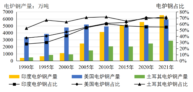 1.印度、美國、土耳其形成了以電爐鋼為主的工藝結構