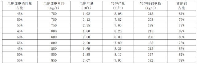 若按照粗鋼產量10億噸、廢鋼利用量3.2億噸,電爐廢鋼消耗量占比分別提升至45%、50%、55%,電爐廢鋼單耗分別提升至750千克/噸、800千克/噸、850千克/噸測算,不同條件下轉爐鋼占比基本保持在80%左右,見表1。