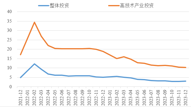 圖4  高技術產業投資增速對比整體投資增速(累計同比,%)