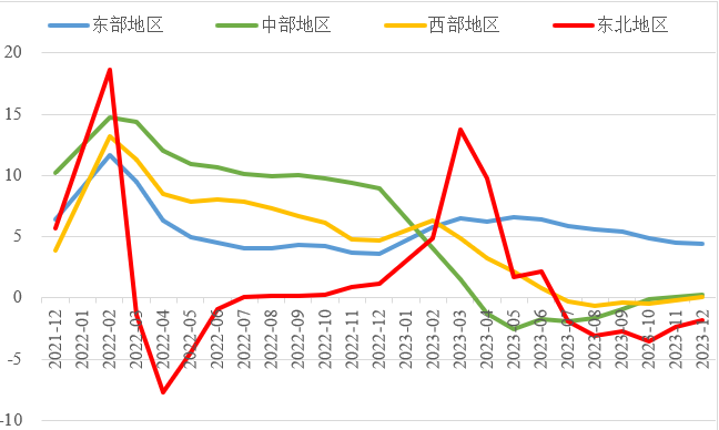 (三)東部地區投資保持較快增長,東北地區投資延續負增長。今年以來,中咨公司承接31個省市委托的項目中,東部、中部、西部和東北地區占比分別為43%、16%、36%、5%。2023年,我國東部地區投資同比增長4.4%,較全國水平高了1.4個百分點;中部、西部地區投資增速由負轉正,分別同比增長0.3%、0.1%;東北地區投資同比下降1.8%,降幅較前三季度有所收窄。