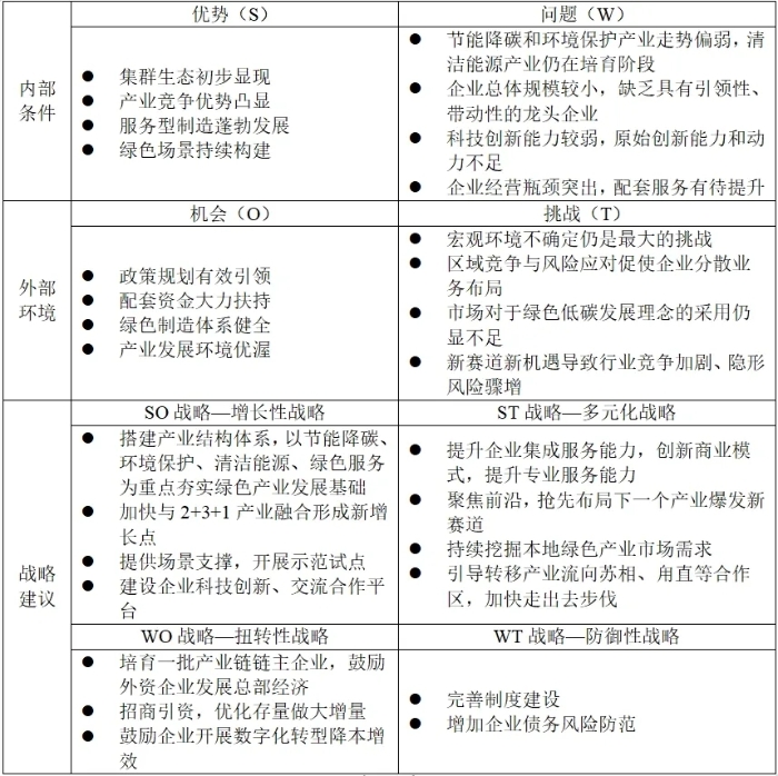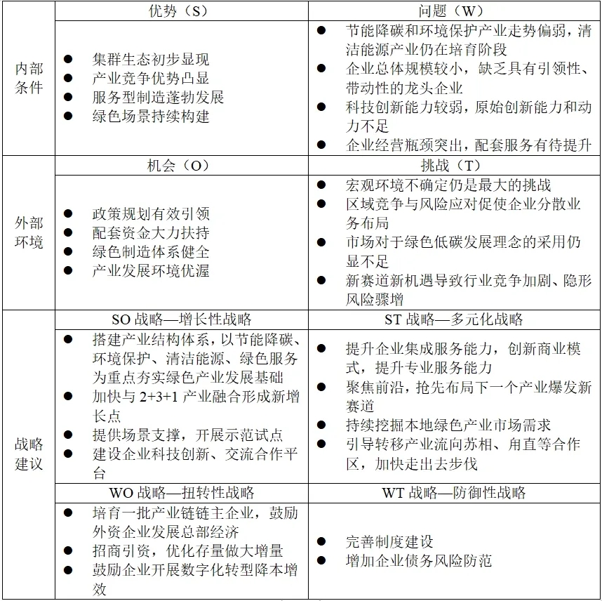 蘇州工業園區綠色產業發展 SWOT分析與策略研究 徐璐 薛會 許相敏 摘要:蘇州工業園區自成立以來,堅定不移走以綠色為底色的高質量發展之路,積極構建具有國際競爭力、自主可控的綠色技術和產業體系。本文通過梳理綠色產業概念、開展蘇州工業園區綠色產業SWOT分析,提出蘇州工業園區綠色產業未來發展對策建議。 關鍵詞:蘇州工業園區;綠色產業;SWOT分析 綠色是新時代中國的鮮明底色,綠色發展是中國式現代化的顯著特征,中國堅定不移地走綠色發展之路。2019年2月,為明確綠色產業發展重點,國家發展改革委會同有關部門印發了《綠色產業指導目錄(2019年版)》,明確了綠色產業類別和內涵[1]。2024年3月,為適應綠色發展新形勢、新任務、新要求,修訂形成《綠色低碳轉型產業指導目錄(2024年版)》,細化了相關產業的具體內涵和要求,為培育壯大綠色發展新動能、加快發展方式綠色轉型提供支撐,為各地方、各部門制定完善相關產業支持政策提供依據。 一、蘇州工業園區綠色產業發展現狀梳理 綠色發展是蘇州工業園區與生俱來的基因。蘇州工業園區自成立以來,始終堅持高起點、高標準、高水平謀劃推進綠色園區建設,牢固樹立和踐行“綠水青山就是金山銀山”的理念,構建起“2+3+1”特色產業體系(“2”指新一代信息技術、高端裝備制造兩大主導產業,“3”指生物醫藥、納米技術應用、人工智能三大新興產業,“1”指現代服務業),先后獲評了首批國家生態工業示范園區、國家循環經濟試點園區、首批低碳工業園區試點、首批國家綠色園區,成為能耗低、生態優、環境美的綠色發展工業園區示范樣本[2]。 但由于“綠色產業”概念相對較新,蘇州工業園區尚未對綠色產業進行家底梳理。本研究在《綠色產業指導目錄(2019年版)》《綠色產業指導目錄(2023年版)》(征求意見稿)的指引下,結合《節能環保清潔產業統計分類(2021)》《戰略性新興產業分類(2018)》《國民經濟行業分類(2019修訂版)》,對蘇州工業園區綠色產業總體情況進行統計分析。經統計,截至2022年,蘇州工業園區綠色產業企業約6700家,產業總體營收/產值規模約1300億元,其中納入統計的規上企業總體營收/產值規模約1200億元,已形成涵蓋節能降碳、環境保護、資源循環利用、清潔能源、基礎設施綠色升級、綠色服務等領域的產業集群。 優先發展綠色產業,是否會打破蘇州工業園區原有產業發展體系格局?本研究認為綠色產業不是一種產業門類,也不局限于某些國民經濟行業分類,而是能夠與生態環境形成良好互動并可持續發展的所有業態,其與蘇州工業園區“2+3+1”產業體系之間既不是包含從屬關系也不是并列關系,而是相互交叉關系,如節能降碳產業包含部分新一代信息技術、高端裝備制造、納米材料、人工智能、現代服務業以及其他產業。 圖1 蘇州工業園區綠色產業與“2+3+1”產業體系關系 二、蘇州工業園區綠色產業SWOT分析 (一)發展優勢 集群生態初步顯現。蘇州工業園區綠色產業生態較完整,覆蓋裝備制造、綠色服務、建設運營以及系統集成等各類業態。裝備制造主要包括高效節能裝備制造、新能源與清潔能源裝備制造。綠色服務主要包括研發設計、檢驗檢測、污染治理等。建設運營領域集聚了電站建設、光伏運營、設備運維等一批典型企業。此外,豐富的綠色產業業態孕育了一批具有整合功能的“集成商”,整合了上游的技術研發企業,中游的設備制造企業,下游的項目建設運營企業等,有力地推動了產業集聚發展。 產業競爭優勢凸顯。蘇州工業園區企業聚焦主業、精耕細作,形成一批在細分領域具有行業話語權的“尖峰企業”。在市場占有率方面,阿詩特、艾默生、快可光伏、協昌環保等企業產品于國內外廣受歡迎;在產品競爭力方面,羅博特科、金龍聯合汽車、迪諾拉電極等企業產品技術領先、產品性能優異、品牌能力突出;在標準起草方面,博萃循環、玉柴再制造、三浦工業、泰諾風保泰等企業體現了自身技術水平在行業內的權威性和代表性,其中博萃循環參與國際級標準制定工作。 服務型制造蓬勃發展。蘇州工業園區綠色產業企業結合自身實際特點和所處行業特性,不斷探索發展新業態新模式,以依斯倍、沃特維自動化、華天國科、京能科技、神彩科技、中恒普瑞、澤尼特泵業、和順電氣為代表的企業在總集成總承包、智能運維、全生命周期管理、工業互聯網等領域形成有效經驗。同時,以優美科、艾默生為代表的企業可為集團總部、社會層面提供檢驗檢測、人才培訓、管理咨詢等相關服務。 綠色場景持續構建。蘇州工業園區積極開展碳達峰試點園區和近零碳園區建設,分布式光伏、分布式能源站、集中供冷供熱項目、儲能電站、能源管理平臺、充電站充電樁等一批綠色技術應用示范場景持續拓展。其中碳普惠智能服務平臺是全國首個實現自愿減排交易的市場化碳普惠體系,東吳黃金“光儲直柔”項目是國內首個公共建筑“光儲直柔”零碳項目,碳達峰平臺可對區域級、園區級、企業級等不同級別進行個性化、自動化、信息化數據采集和過程監控。 (二)環境機遇 政策規劃有效引領。蘇州工業園區出臺有《蘇州工業園區“十四五”生態環境保護規劃》《蘇州工業園區電力專項規劃(2021-2035)》《蘇州工業園區城市綠地系統規劃(2018-2035)》等一批專項規劃,《蘇