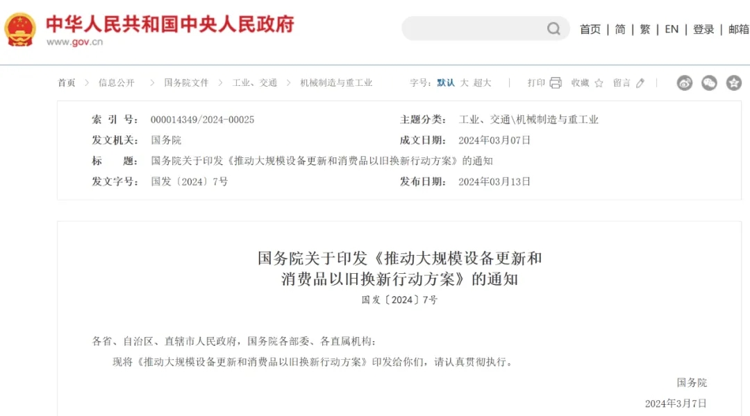 近日,國務院印發《推動大規模設備更新和消費品以舊換新行動方案》(國發〔2024〕7號,以下簡稱7號文),重點實施設備更新、消費品“以舊換新”、回收循環利用、標準提升四大行動,并明確提出加大財政政策支持力度和優化金融支持,為大規模設備更新和消費品“以舊換新”提供堅實有效的政策保障。 習近平總書記在主持召開中央財經委員會第四次會議時強調,加快產品更新換代是推動高質量發展的重要舉措,將有力促進投資和消費,既利當前、更利長遠。 產品更新換代促進的是有效投資, 激發的是綠色消費 當前,我國經濟持續回升向好的基礎還不穩固,突出矛盾是有效需求不足,企業投資和居民消費的意愿不強。推動大規模設備更新,是將擴大內需和深化供給側結構性改革有機結合起來的具體體現。通過政策激勵,引導企業加大投資,對不符合能耗、環保、安全生產等最低標準的生產設備進行淘汰更新,對運行效率較低的“啞設備”進行數字化、智能化更新升級,進一步提升技術工藝水平,為消費者提供更加優質、綠色、智能的產品,對企業來說可以提高生產效率和產品質量,對國家來說可以拉動有效投資,為經濟增長提供強勁支撐。 同時,近年來受諸多不利因素影響,很多家用汽車、家電、家具等大件消費品更換頻率較低,消費品更新換代需求有提升潛力。新一輪消費品“以舊換新”,將以綠色、智能、安全消費品更新升級為重點,促進與居民生活密切相關消費品從“有沒有”轉向“好不好”,加快淘汰符合強制報廢標準和具有安全隱患的“超期服役”產品,如淘汰國三以及以下排放標準或車齡15年以上的乘用車,以及超過安全使用年限標準的家電產品。可以說,這輪政策實施不僅有利于提高居民生活品質,而且將有效拓展新的綠色低碳消費空間,培育新型消費,充分激發市場對高端產品和服務的潛在需求。 以新質生產力為引領助推產業升級 2024年1月31日,習近平總書記在中共中央政治局第十一次集體學習時強調,新質生產力就是創新起主導作用、擺脫傳統經濟增長方式、生產力發展路徑,具有高科技、高質量、高效能特征,符合新發展理念的先進生產力質態。產品更新換代的實質就是先進替代落后,7號文提出以工業、建筑、農業、交通、教育、文旅、醫療等七大領域為重點,以產品更新和設備升級帶動我國產業高端化、智能化、綠色化發展,提升安全可靠水平,為發展新質生產力創造良好的市場環境。 據測算,我國超過20%在運的用能設備未能達到最低能耗限額標準,設備更新以堅持鼓勵先進、淘汰落后為原則,推廣應用能效達到先進水平和節能水平的用能設備,可以有效降低生產過程中的能耗和碳排放。推廣應用智能制造設備和軟件,培育數字經濟賦智賦能新模式,可以提高生產線的數字化、智能化程度,優化工藝流程,減少人工操作失誤,提高生產效率和質量,推動先進產能比重持續提升。 “換新+回收”,促進資源循環利用 大規模設備更新和消費品“以舊換新”必將帶來大量老舊設備和產品的回收循環利用問題,對“退役”設備和各類廢棄產品進行妥善處置和循環利用是大規模設備更新和消費品“以舊換新”順利實施的重要保障。7號文將回收循環利用行動作為四大行動之一,推行“換新+回收”模式,對于促進資源循環利用、提高經濟循環質量和水平具有重要意義。 實施好回收循環利用行動,關鍵要堅持產品全生命周期理念,形成產品從設計研發到回收利用的良性循環。要大力推行產品和設備的生態設計,使廢舊產品和設備易拆解、易回收。要加快完善廢舊產品和設備回收體系,積極構建“換新+回收”新模式,引導二手車和二手電子產品市場便利化、規范化發展,促進汽車零部件、工程機械、機床等廢舊生產設備再制造,鼓勵風電光伏、動力電池等產品設備及關鍵部件梯次利用,有效提高廢舊產品設備中廢鋼鐵、廢有色金屬、廢塑料等各類材料的資源再生效率,為二手商品交易、再制造、資源再生利用等循環利用產業發展創造廣闊的市場空間。同時,要進一步提升再生材料在原材料供給中的占比,降低戰略性原生資源的進口依賴。 財政和金融政策是激發企業 加快產品更新換代的動力源泉 當前,我國工業企業面臨諸多困境。經歷不利因素沖擊,經濟恢復發展仍有不少難題,長期積累的深層次矛盾加速顯現,外需下滑和內需不足碰頭。2023年,規模以上工業企業利潤較上一年下降2.3%,規模以上工業產能利用率為75.1%。此外,新一輪科技革命和產業變革正在重構全球創新版圖、重塑全球經濟結構,大國關系出現了轉折性變化,嚴重影響我國的對外貿易經濟。企業維持穩定生產經營的壓力較大,持續增加投資的決策趨于保守。大規模設備更新堅持市場為主、政府引導,為激發企業和消費者產品更新意愿,7號文打出了財稅、金融、要素保障的政策“組合拳”。 (一)進一步加大財稅金融支持力度, 切實降低企業負擔 一是針對既有財政支持的工作,如老舊營運車船更新補貼、農業機械報廢更新補貼、城市交通發展獎勵資金等,統籌用好既有財政支持政策,進一步加大資金投入力度,支持更多符合要求的項目建設實施,更好發揮財政資金的杠桿撬動作用。 二是針對尚無財政渠道支持的領域,中央統籌利用中央預算內投資、中央財政專項、超長期特別國債資金等各類資金支