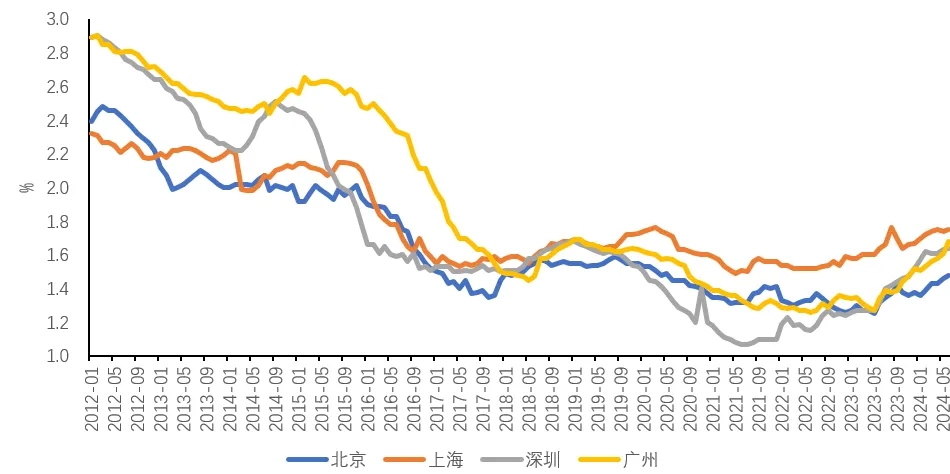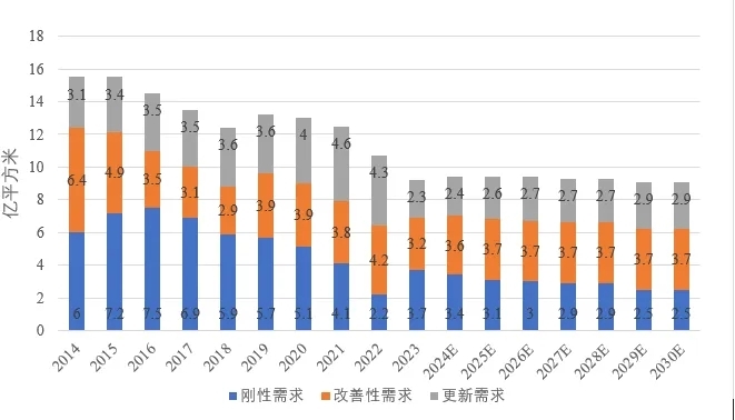 房地產是宏觀經濟研究的重要領域,深入研判房地產發展歷史、走勢和相關因素,在當前具有很強的現實意義。本文《“以時間換空間”,房地產進入平臺探底期》是房地產系列研究之一,研究認為,當前我國房地產市場發展進入新平臺期,新增商品房需求將呈現“L”型回落趨勢,主流房企正在探索房地產發展新模式,地產潛在衍生風險需持續監測,未來政策仍以時間換空間,政策工具箱將適時打開。 01 我國房地產進入第五階段:尋找新的平臺期 第一階段:1998—2007年,地產發展的黃金十年,消費需求驅動的商品房市場化階段,房地產投資平均增速24%,商品房銷售面積平均增速20%,行業毛利潤率平均水平31%,2008年的居民杠桿率18.5%。 第二階段:2008—2016年,地產發展的白銀十年,投資需求驅動房地產市場穩定發展期,居民大幅加杠桿,房地產投資平均增速下降至18.5%,商品房銷售面積平均增速下降至9.4%,行業毛利潤率下降至27%,居民杠桿率上升至42.7%,企業進入金融驅動的高周轉模式。 第三階段:2017—2021年,房住不炒政策驅動的結構性分化期,房地產投資平均增速下降至8.1%,商品房銷售面積的規模穩定在17億平方米,增速趨緩,但城市間的分化和周期輪動明顯加快,三、四線城市趨冷,一、二線窄幅波動。 第四階段:2021年7月—2024年5月,去杠桿政策驅動加速下滑期,開啟了房地產“去金融化”進程,商品住宅銷售面積從15.7億平方米下降至9.5億平方米,房價全面下降,居民杠桿率達到64.12%。 第五階段:2024年5月開始進入尋找新的平臺期階段,“517政策”后,一系列房地產政策出臺表明政策轉向態度明確,其目標是落實守住不發生系統性風險底線,但不會重走“漲價去庫存”的老路。2024年6月以來,房地產行業雖持續處于深度調整過程中,但主要行業指標跌幅有所收窄,2024年上半年房地產開發投資同比下降10.1%,但二季度房地產開發投資較一季度增加37.9%,較去年同期減少6.5%,這表明季度內開發投資雖同比持續下跌,但跌幅低位趨穩;房屋新開工規模仍處歷史低位,同比跌幅逐月收窄,二季度新開工面積20740萬平方米,較上季度增加20.0%,同比減少19.5%;二季度,全國商品房銷售面積25248萬平方米,較上季度增加11.4%,同比減少14.6%,商品房銷售金額25778億元,較上季度增加22.7%,同比減少20.8%,新建商品房銷售面積及金額同比跌幅較上季度末有所收窄;國房景氣指數從一季度末的92.07回調至92.11。 圖1 我國房地產開發投資完成情況 (單位:億元,%) 02 我國新增商品房需求將呈現“L”型回落趨勢,預計年均新增需求中樞約為9.3億平方米,需求增速中樞為-3.6%,投資增速中樞為-1.4% 從房地產銷售的預測框架來看,商品房兩大屬性=居住+投資。在全面去金融化趨勢下,假設投資需求為0,則新建商品房需求=新增剛性需求(適齡購房人口+城鎮化率)+新增改善需求(人均居住面積)+新增更新需求(舊改、棚改)-存量房供給-新建保障性住房,人口負增長、城鎮化率增速放緩、人均住房面積提升帶來剛性(2.9億平方米/年)和改善需求(3.7億平方米/年)下降,但舊房更新需求(2.7億平方米/年)和新建保障性住房增加,帶來新增商品房需求逐年回落,但斜率趨緩。總體來看,我國新型城鎮化仍在持續推進,房地產高質量發展還有相當大的空間。 圖2 我國住房總需求及其構成的預測 (單位:億平方米) 注:根據任澤平研究團隊《中國住房需求測算2024》模型修正估算。 03 目前房地產行業基本面仍處于下行階段,供需兩端下行趨勢仍然嚴峻,但市場出現了“筑底”信號 2024年上半年,房地產行業基本面仍處于下行階段,但得益于短期從中央到地方利好新政刺激,銷售面積、金額同比降幅略有收窄,新開工、竣工止跌企穩,6月市場開始出現“筑底”信號,但這不是拐點信號,市場仍處于下行階段。2024年1-6月,全國商品房銷售面積4.79億平米,同比下降19.0%;商品房銷售額4.71萬億元,同比下降25.0%;從6月單月數據來看,商品房銷售面積為1.13億平方米,環比上漲52.5%;商品房銷售額為1.15萬億元,環比上漲50.9%。截至2024年6月末,商品房待售面積73894萬平方米,同比增長15.2%,其中,住宅待售面積增長23.5%,庫存壓力嚴峻。1-6月,中指355城住宅土地成交面積和金額分別同比下降38.1%和44.3%;房屋新開工面積3.80億平方米,同比下降23.7%;房屋竣工面積2.65億平方米,同比下降21.8%。本輪房地產去庫存面臨更大壓力,去化周期2024年6月已達到23.8個月。房價深度調整,截至2024年6月連續26個月負增長,根據中原領先指數可知,目前一線城市二手房房價平均降幅達25%。國家金融監管總局數據顯示,今年5月份首套房貸平均利率3.45%,二套房貸平均利率3.9%,分別比上年同期下降0.55和1個百分點,達到2008年以來的最低值。 圖3 我國商品房庫存變化情況 (單位:萬平方米,%) 進一步市場區分來看,重點城市在以價換量、政策優化帶動下,二手房市場表現明顯好于新房市場,根據中指數據,2024年1-5月,重點25城二手住宅成交套數同比下降12.9%,而同口徑新房成交套數下降42.7%;6月以來,二手房周均成交套數較上年同期增長24.1%。供給因素、保交樓、定價差異是新房與二手房走勢分化的主要原因,部分二線城市的二手房均價已經較新房低15%。這就導致傳統的需求支持政策(限購限貸放松、利率下降等)可能會讓購房需求優先流入二手房市場,而非新房市場。因此,如果居民價格預期持續走低,此前居民購買的非剛需住房或將逐步形成二手