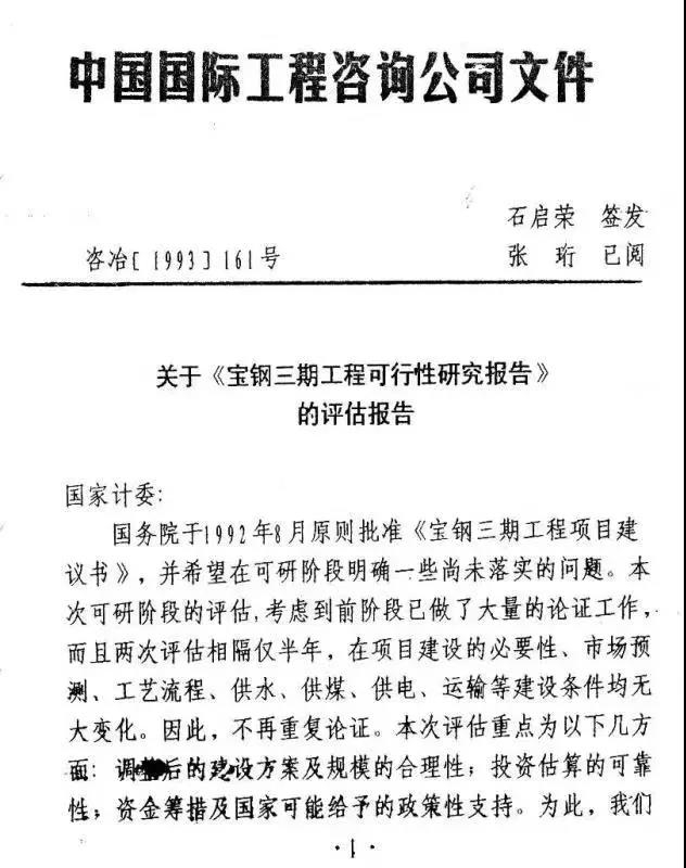 編者按:《共和國的鋼鐵歲月》一書通過對中國國際工程咨詢公司原黨組書記、總經理石啟榮同志的訪談,揭示了我國鋼鐵工業發展過程中一些鮮為人知的故事,再現了鋼鐵工業艱苦卓絕、波瀾壯闊的發展歷程,為鋼鐵工業的歷史傳承和轉型升級注入了新的正能量。本書20余萬字,由在石啟榮身邊工作的同志們歷經十多年收集整理而成,圖文并茂,內容翔實,對了解共和國火紅的鋼鐵年代具有很高的史料價值,對鋼鐵工業未來發展也具有現實意義。 本文全文摘錄自該書第一部分。 寶鋼集團有限公司(以下簡稱“寶鋼”)是中國改革開放的產物,1978年12月23日,黨的十一屆三中全會閉幕的第二天,在上海北翼長江之畔的寶山區打下第一根樁。經過39年的發展,寶鋼已成為中國現代化程度最高、最具競爭力的大型鋼鐵聯合企業。 2016年,寶鋼連續十三年進入美國《財富》雜志評選的世界500強榜單,列第275位,在世界鋼鐵企業排序中列第5位。寶鋼的建設,極大地促進了中國鋼鐵工業的技術進步,實現了中國鋼鐵工業的跨越式發展,從此,我國鋼鐵業開始躋身世界先進行列。 寶鋼工程是國家的一個重大建設項目,當初建設這樣的大鋼廠,必須把全社會的力量組織起來,舉全國之力來實施。 寶鋼打下第一根樁 1978年12月-1985年9月,第一座高爐及相應的煉鋼、公輔設施投入生產,人們習慣稱之為寶鋼“一期”工程。 1985年10月-1992年7月,第二座高爐及煉鋼、軋鋼工程相繼投入生產,人們稱之為寶鋼“二期”工程。需要說明的是,寶鋼與日本簽訂的合同中并無一期、二期之分。 20世紀90年代,第三座高爐、1580mm熱連軋機、1550mm/1420mm冷連軋機、相應的公輔設施投入生產,人們稱之為寶鋼 “三期”工程。 進入21世紀,寶鋼又建設了1850mm熱連軋及1800mm冷連軋汽車板生產線、4號高爐、5m寬厚板軋機以及廣東湛江鋼鐵基地等。 在寶鋼39年發展的風風雨雨中,石啟榮同志矢志不渝地支持寶鋼,他一直謀劃和指導寶鋼的現代化建設,為寶鋼的發展壯大作出了貢獻。 1980年5月,石啟榮同志擔任國家建委重工業局副局長。 1982年,國家建委撤銷,一分為三,其國土資源局并入國家計委,建設局、標準定額局、設計局、標準研究所并入建設部,能源局、交通局、重工業局和綜合局成立基建辦公室并入國家經濟委員會,石啟榮任辦公室副主任。1982年5月,國務院代表韓光主持“寶鋼建設現場辦公會議”,石啟榮同志協助國務院代表,全面負責寶鋼對外、對內各項事務。寶鋼一期共召開8次國務院代表會議、二期共召開10次國務院代表會議。 1983年,基建辦公室撤銷,石啟榮任國家經委委員。 1984年年初,原基建辦公室的全部建制并入國家計委,石啟榮任國家計委委員。當時為推動寶鋼建設,國家經委、計委成立了“計委、經委寶鋼建設聯合辦公室”,石啟榮同志任辦公室主任,兩委重工業局的領導任副主任,解決寶鋼工程建設中涉及計委、經委相關事宜。 1985年10月后,石啟榮同志任國家計委委員、專職委員、黨組成員,同時兼任中國國際工程咨詢公司黨組書記、總經理(副部長級)。 1994年1月以后,石啟榮同志擔任國家發展改革委顧問。 1996年1月,石啟榮同志卸任中國國際工程咨詢公司總經理后擔任專家委員會主任,繼續為寶鋼的后續建設發展出謀劃策。 寶鋼每一個重大建設項目,石啟榮都親自帶隊實地考察、策劃、評估,遇到問題不遺余力地協調解決,時刻關心著寶鋼的健康成長。 本篇以時間為脈絡,摘取石啟榮同志在寶鋼各期建設過程中做出的幾件有代表性事件,以點映面,以饗讀者。 01 改革開放,寶鋼揚帆正當時 1976年年底,十年“文革”浩劫剛剛結束,百廢待興,國家經濟十分困難,各行各業亟須重整旗鼓,上下都憋足了勁,要把失去的十年補回來,我國由此進入新的歷史發展時期,社會主義現代化建設被重新提到最重要的議程上。 當時全國鋼產量僅有2100萬t,生產技術落后,無法滿足社會主義現代化建設的需要,技術含量高、附加值高的鋼材基本全部依賴進口。 石啟榮同志的匯報手稿(摘選) 1977年1月,上海市和冶金工業部提出,為了解決長期以來我國鋼材供需矛盾,趕上世界先進冶金技術水平,促進全國鋼鐵工業現代化的發展,國家亟須建設一個現代化的大型鋼鐵企業。 20世紀70年代初期,中日兩國正式建交,日本經濟經過20多年的高速發展,工業技術已經處于全球領先地位,也積累了大量的外匯,而中國擁有廣闊的市場空間,雙方加強合作可以實現互惠共贏。1977年10月,鄧小平訪問日本,參觀了新日本鋼鐵公司君津鋼鐵廠,對陪同的對華友好人士新日鐵會長稻田嘉寬和社長齋藤英四郎說:“你就照這個工廠的樣子幫我們建設一個。”日方積極回應, 愿意提供低息貸款,新日鐵提供全部的技術和設備。1978年春天,經中央政治局、國務院會議討論后,作為從國外引進的22項重點工程之一,中央批準在上海寶山建設寶鋼這一新中國成立以來規模最大、投資最多、技術最新的特大工程項目。 寶鋼成立工程指揮部 02 舉國之力,國務院代表由來 新中國成立后,我國的基本建設程序照搬蘇聯模式,從中央到地方再到具體工程的體系都按蘇聯規定設置。寶鋼在開工前的工作做得很不夠。按照基本程序,開工建設之前要做“三通一平(即通水、通電、通路、場地平整)”。所謂的“工期”,是從開工到建成,即主要工程的基礎施工開始至投產為止(主要產品第