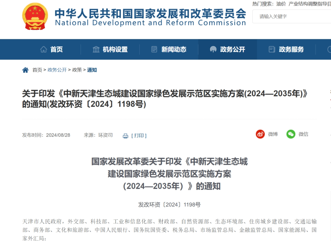 發揮中新合作平臺優勢 高標準高質量建設國家綠色發展示范區 ——《中新天津生態城建設國家綠色發展示范區實施方案(2024—2035年)》解讀 朱黎陽 范瑩瑩 近日,經國務院批復同意,國家發展改革委印發《中新天津生態城建設國家綠色發展示范區實施方案(2024—2035年)》(發改環資〔2024〕1198號,以下簡稱《方案》),立足新形勢新要求,從多個維度對下一階段中新天津生態城(以下簡稱生態城)建設國家綠色發展示范區升級版的目標任務作出了全面系統部署。 01、《方案》是新征程上生態城綠色發展的施工圖 2013年,生態城成為首個國家綠色發展示范區。2013年5月,習近平總書記在生態城視察時強調,“生態城要兼顧好先進性、高端化和能復制、可推廣兩個方面,在體現人與人、人與經濟活動、人與環境和諧共存等方面作出有說服力的回答,為建設資源節約型、環境友好型社會提供示范”。十多年以來,生態城認真貫徹落實習近平總書記對天津及生態城的重要指示精神,全力推動國家綠色發展示范區建設取得豐碩成果,從鹽堿荒灘蛻變成生態之城、智慧之城、幸福之城,成為生態文明建設的示范區、綠色發展體制機制的創新區和綠色思想文化的策源地。 在新征程的新起點上,《方案》提出了生態城新十年建設國家綠色發展示范區“3+20”的任務目標體系。確立了綠色發展的三項示范任務,一是要在綠色低碳產業效益上發揮先導帶動作用,形成具有國際競爭優勢的綠色低碳產業集群,單位地區生產總值二氧化碳排放水平保持領先;二是在綠色低碳創新能力上發揮先行引領作用,培育一批綠色低碳技術創新載體和平臺,取得一批綠色低碳技術知識產權,形成綠色低碳高質量發展技術和標準支撐體系;三是在綠色低碳開放合作上發揮重要牽引作用,打造產業合作、技術轉移、人才培養平臺,建設綠色低碳領域國際合作重要樞紐。同時,《方案》還結合生態城發展實際,提出了20項具體指標,部分指標達到國際領先水平,比如,單位GDP二氧化碳排放量,我國的平均水平約1噸二氧化碳/萬元,發達國家水平約為0.2噸二氧化碳/萬元,生態城目前是0.27噸二氧化碳/萬元,2035年目標值是0.2噸二氧化碳/萬元以下。此外,還有一些指標也具有較強的先進性,比如,到2035年,研發經費投入強度翻倍,綠電占全社會用電量比重達到近100%。這些任務和指標不僅體現了國家對生態城未來發展的高要求,也彰顯了生態城在綠色發展領域的國際視野和雄心壯志。 當前,我國已經開啟全面建設社會主義現代化國家新征程,我們要建設的現代化是人與自然和諧共生的現代化,要加快經濟社會發展全面綠色轉型。8月11日,中共中央、國務院印發《關于加快經濟社會發展全面綠色轉型的意見》,提出將綠色轉型的要求融入經濟社會發展全局,全方位、全領域、全地域推進綠色轉型,形成節約資源和保護環境的空間格局、產業結構、生產方式、生活方式?!斗桨浮妨⒆阈滦蝿菪乱?,深入貫徹黨的二十大和二十屆二中、三中全會精神,認真貫徹習近平生態文明思想,重新布局生態城綠色發展的目標任務,提出打造以綠色低碳高質量發展為主線、以高附加值細分產業為重點、以國際一流營商環境為特征的國家綠色發展示范區,推動綠色發展理念融入生態城經濟社會發展各領域全過程,為加快經濟社會發展全面綠色轉型探索新路徑。 02、《方案》充分發揮中新合作平臺優勢,建設綠色低碳開放合作的新高地 黨的二十屆三中全會提出,開放是中國式現代化的鮮明標識。必須堅持對外開放基本國策,堅持以開放促改革,依托我國超大規模市場優勢,在擴大國際合作中提升開放能力,建設更高水平開放型經濟新體制。生態城作為中國和新加坡兩國政府間重大合作項目,是世界上首個國家間合作開發的生態城市。過去十多年,中新雙方圍繞高水平合作,探索建立了一整套全新的區域合作開發模式,形成了獨具特色的合作交流渠道,最大程度發揮了雙方政策、資金、資源等綜合優勢。在京津冀協同發展戰略中,生態城、雄安新區、北京通州以三角之勢起到支撐引領作用。在建設國家綠色發展示范區的過程中,生態城要充分發揮在綠色低碳開放合作上的重要牽引作用。 面向2035年,《方案》全面落實黨的二十屆三中全會精神,充分發揮中新合作平臺優勢,繼續深化中新兩國在綠色技術、綠色裝備、綠色服務、綠色基礎設施、綠色金融等方面的交流合作,導入新加坡優質綠色產業資源,持續拓展中新合作深度和廣度,將生態城打造成中國面向共建“一帶一路”國家開展綠色低碳技術成果交流、產業合作和經貿往來的重要窗口。一是借助新加坡國際航運樞紐、貿易中心和金融中心資源優勢,依托天津港智慧近零碳碼頭,吸引新加坡航運、海事等企業落地。二是充分發揮高校、科研院所、龍頭企業創新帶動作用,加強與新加坡政府部門、科研院所、協會組織合作,積極引進綠色技術研究院、綠色創新實驗室和知名投資機構等優質創新資源。三是借鑒新加坡政府部門服務企業的理念,完善相關體制機制,優化營商環境,及時解決企業在生產經營、技術研發、市場開拓中遇到的各類問題,快速導入國際國內先進綠色低碳技術和龍頭企業。這不僅有助于生態城自身的發展,也為我國面向共建“一帶一路”國家開展綠色低碳技術成果交流、產業合作和經貿往來
