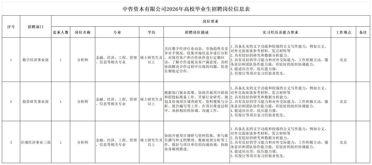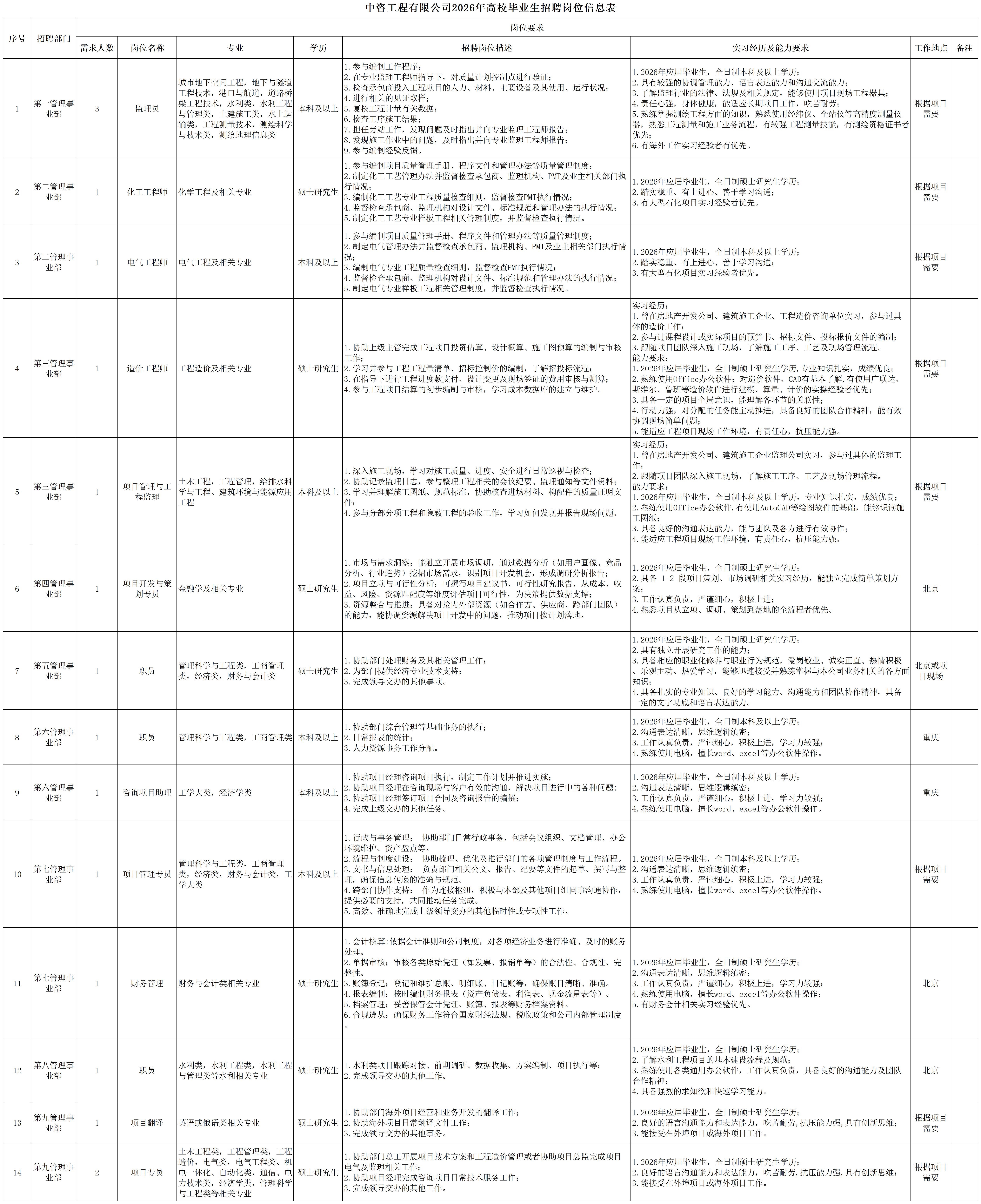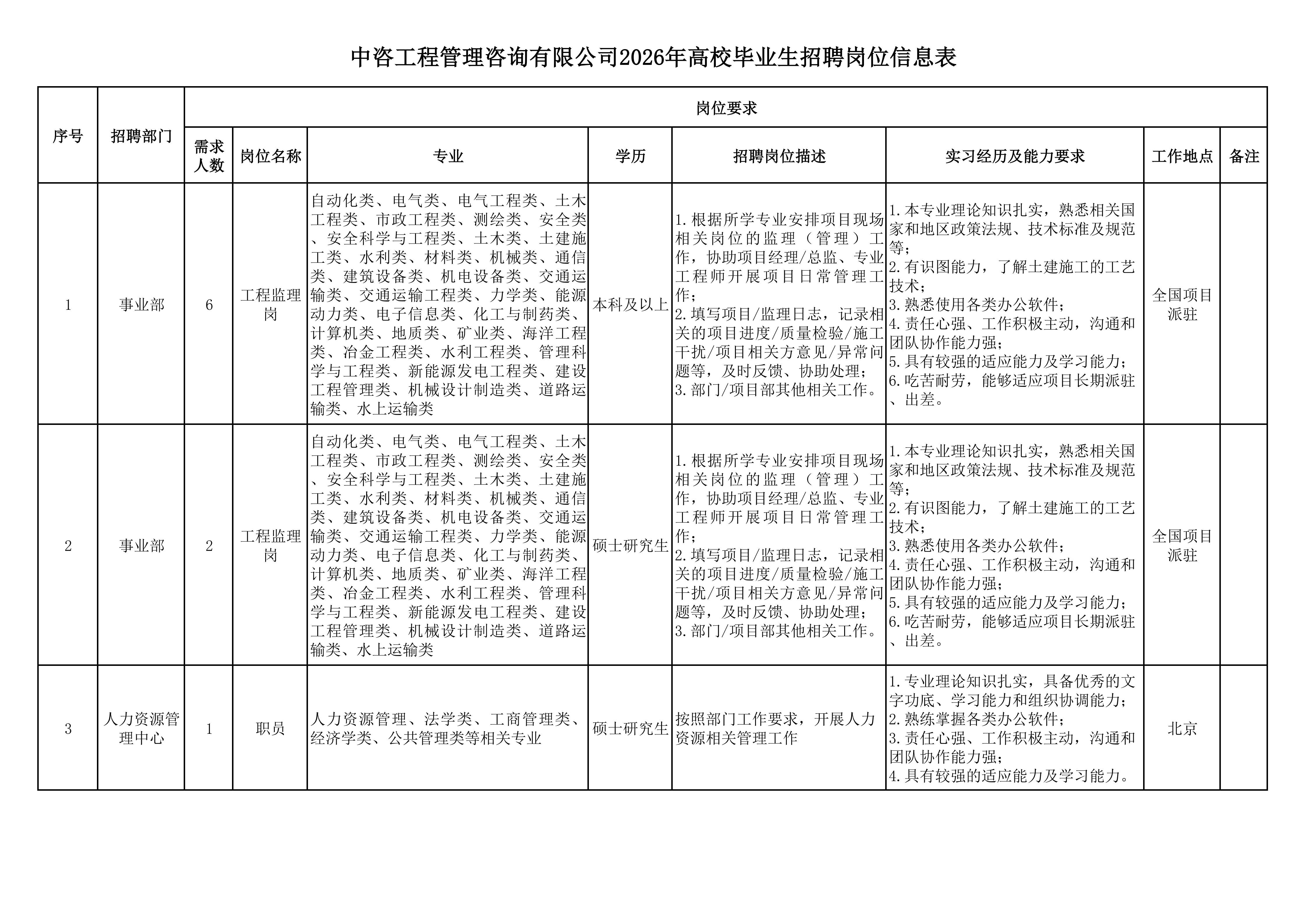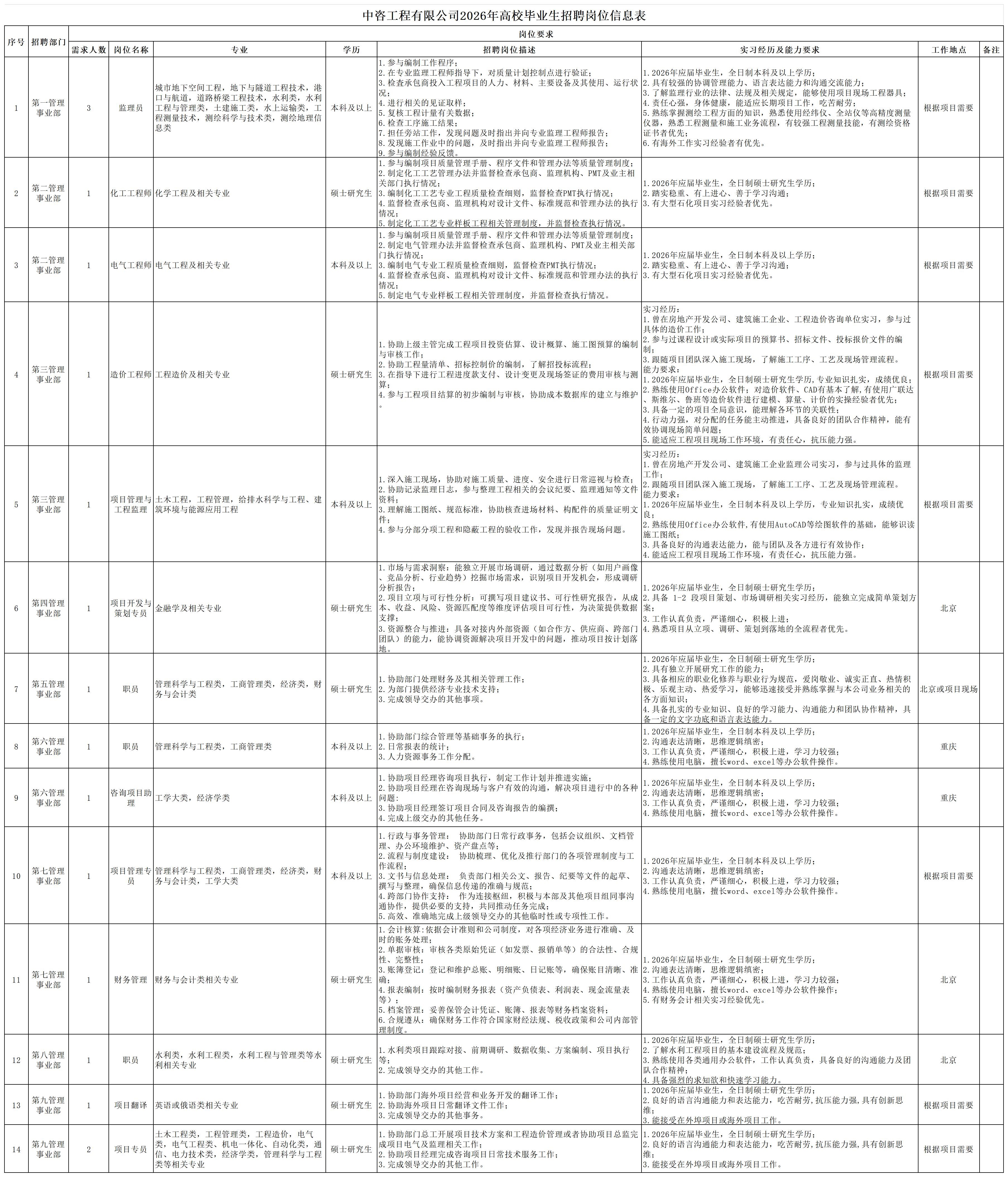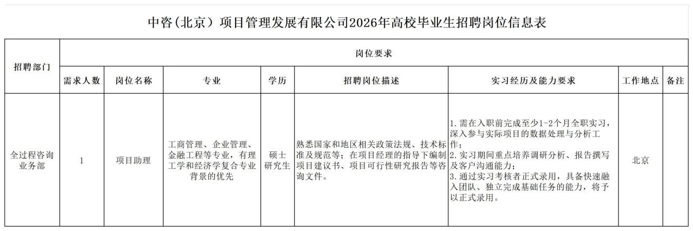 一、公司簡介 中咨工程管理咨詢有限公司(簡稱中咨管理)成立于1989年,是中國國際工程咨詢有限公司的核心骨干子公司,注冊資金1.55億元?,F有各項資質證書持證2800余冊,中高級職稱比例超50%。 中咨管理公司是國內從事工程管理類業務最早、規模最大、行業最廣、業績最多的企業之一,具有工程咨詢甲級資信、工程監理綜合資質以及設備、公路工程、地質災害防治工程、人民防空工程等多項專業監理甲級資質,并列入政府采購招標代理機構和中央投資項目招標代理機構名單。業務涵蓋工程前期咨詢、項目管理、項目代建、招標代理、造價咨詢、工程監理、設備監理、設計優化、工程質量安全評估咨詢等項目全過程咨詢服務,涉及房屋建筑、交通、石化、水利、電力、冶煉、礦山、市政、生態環境、通信和信息化等多個行業。業務遍布全國及全球近50個國家和地區,累計服務各類咨詢管理項目超過1萬個,涉及工程建設投資近5萬億元。曾榮獲56項中國建設工程魯班獎、15項中國土木工程詹天佑獎、64項國家優質工程獎、23項中國鋼結構金獎以及各類省級或行業獎項500余項。 經過30余年的不懈努力,我們積累了豐富的工程管理經驗,為各類工程建設項目保駕護航,“中咨管理”品牌成為行業的一面旗幟。我們崇尚簡單、包容、共享的理念,秉持創造價值、貢獻社會的使命和專業創造精品、價值成就客戶的核心價值觀,為成為全過程工程管理咨詢的領先者而奮斗。優秀的你值得更好的平臺,加入我們,攜手共創新篇章! 二、應聘條件 (一)2026年全日制本科及以上應屆畢業生。 (二)年齡要求:本科生26周歲及以下(2000年1月1日后出生),碩士研究生30周歲及以下(1996年1月1日后出生)。 (三)在校就讀期間無在職工作經歷,無社保繳納記錄和派遣落戶記錄。 (四)成績優秀,人品端正,積極進取,愿與公司共改革、奮進。 (五)具備扎實的專業理論知識和良好的溝通能力,實踐能力較強。 (六)熟練使用各類辦公軟件。 (七)簡歷需注明出生日期、生源地(即入學前戶籍所在地)。 三、應聘程序 發布招聘公告→簡歷投遞→簡歷篩選→筆試→面試→確定人選并公示→發放錄用通知。 四、崗位信息 五、報名方式 本次招聘報名采取在線填報方式進行:應聘者請使用Chrome內核瀏覽器(如:Chrome瀏覽器、360瀏覽器、百度瀏覽器、搜狗瀏覽器、UC瀏覽器等)登錄網站報名,網站鏈接:https://hcmcloud.ciecc.com.cn/recruit/#/index 或使用手機掃描二維碼: 中咨工程有限公司 一、 公司簡介 中咨工程有限公司成立于2010年,是中國國際工程咨詢有限公司(簡稱中咨公司)的控股子公司,由中咨公司和中國廣核電力股份有限公司合資成立。 公司作為中咨公司工程管理業務板塊的核心成員,主營業務為全過程工程管理(咨詢)服務業務,包括全過程中的各節點業務(1+X),業務范圍涉及石化、核電、冶金、交通和民用市政等多個領域行業工程項目的前期咨詢及咨詢管理、勘察管理、設計管理、監理、采購管理、造價咨詢、建造過程管理、項目管理(IPMT、PMC等)、項目代建和技術服務等。 公司以為國家、社會和股東創造價值為己任,以兩大股東提供的廣闊市場機遇和成熟先進的管理體系為發展驅動力,通過積極參與市場競爭,努力培育公司核心競爭能力,打造一支特別能戰斗的具有復合型人才的專業化隊伍,矢志發展成為具備承接大中型全過程工程管理(咨詢)服務業務能力的、具有國際競爭力的工程公司。 二、 應聘條件 (一)2026年全日制本科及以上應屆畢業生(部分崗位碩士研究生學歷),在校就讀期間無在職工作經歷,無社保繳納記錄和派遣落戶記錄,學習成績優良。 (二)良好的語言表達能力和溝通能力,執行力強,學習能力強,協作能力強。 (三)身體健康,具有良好的職業道德修養,具有較強的責任心。 (四)熟練使用常用辦公軟件,具有一定的文字功底。 (五)無違規違法記錄,無不良嗜好,身體素質好,能吃苦耐勞,能承受較大的工作壓力。 三、 招聘程序 發布招聘公告→簡歷篩選→資格審查→綜合能力測評→面試→確定人選并公示→發放錄用通知→入職。 四、 崗位信息 五、 報名方式 本次招聘報名采取在線填報方式進行:應聘者請使用Chrome內核瀏覽器(如:Chrome瀏覽器、360瀏覽器、百度瀏覽器、搜狗瀏覽器、UC瀏覽器等)登錄網站報名,網站鏈接:https://hcmcloud.ciecc.com.cn/recruit/#/index 或使用手機掃描二維碼: 中咨海外咨詢有限公司 一、公司簡介 中咨海外咨詢有限公司是中國國際工程咨詢有限公司所屬二級子公司,于1988年成立,經過30多年發展,為各級政府、企事業單位提供了萬余項咨詢服務,在國內咨詢領域具有一定知名度和較高信譽,具備較好的發展基礎。2021年入選國資委“管理標桿”企業,2022-2025年連續4年蟬聯國資委“雙百行動標桿”企業。 公司主要從事戰略謀劃、投資策劃、全過程咨詢以及規劃設計和建設投資管理經營五大業務。善于謀劃策劃創造發展新優勢,努力成為工程建設領域原創思想策源地;善于科學設計項目功能成本方案,致力成為國內優化設計領域先行者;善于系統提供區域發展整體解決方案,努力成為國內有影響力的具有研究特質的咨詢設計企業。公司為國家高新技術企業,擁有工程咨詢行業綜合甲級資信、15項專業專項甲級資信;公路、建筑、市政行業7項專業甲級設計資質;市政行業2項專業乙級設計資質;