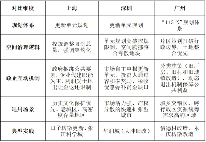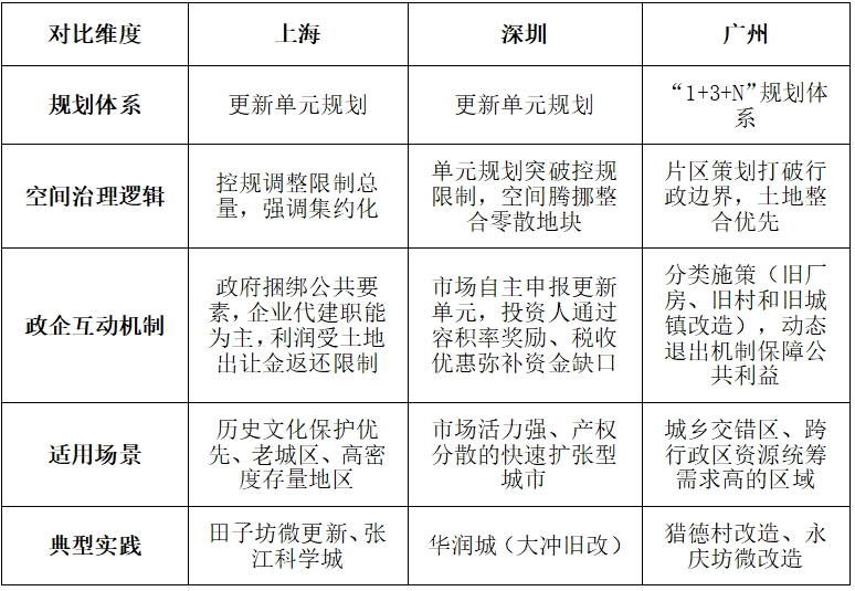 我國城市更新制度體系與經(jīng)驗分析 ——以上海、深圳、廣州為例 石延杰 摘要:隨著我國城鎮(zhèn)化進(jìn)程進(jìn)入存量更新階段,城市更新成為破解空間資源約束、推動高質(zhì)量發(fā)展的重要路徑。本文以國家政策框架為背景,選取上海、深圳、廣州為典型案例,系統(tǒng)梳理三地城市在制度體系、實施路徑與創(chuàng)新實踐上的更新經(jīng)驗。研究發(fā)現(xiàn),上海側(cè)重政府統(tǒng)籌下的剛性規(guī)劃與公共利益保障,深圳依托市場化政策工具,探索高強(qiáng)度開發(fā)與公共利益兼容機(jī)制,廣州則通過分類施策與多元主體利益協(xié)調(diào)機(jī)制破解復(fù)雜更新難題。研究建議,未來城市更新需立足城市稟賦優(yōu)化制度供給,通過健全法律體系、創(chuàng)新多元融資機(jī)制、深化公眾參與,實現(xiàn)空間治理現(xiàn)代化與經(jīng)濟(jì)、社會、文化價值的協(xié)同提升。 關(guān)鍵詞:城市更新;政策體系;經(jīng)驗分析 近年來,隨著我國城鎮(zhèn)化水平的提高,大量城市在經(jīng)歷快速擴(kuò)張后逐漸面臨空間資源緊張、基礎(chǔ)設(shè)施老化、生態(tài)環(huán)境惡化、文化遺產(chǎn)保護(hù)壓力增大等問題。在“增量建設(shè)”空間日趨飽和的背景下,如何通過城市更新對既有建成區(qū)進(jìn)行功能重塑、空間優(yōu)化與人居環(huán)境提升,成為城市高質(zhì)量發(fā)展的重要議題[1]。城市更新由此成為我國城市轉(zhuǎn)型升級過程中的關(guān)鍵抓手,既要滿足城市經(jīng)濟(jì)再增長的需求,也要兼顧文化和環(huán)境的多重價值。 一、現(xiàn)階段我國城市更新政策體系及特點 為引導(dǎo)各地因地制宜地實施城市更新,國家相關(guān)部門先后出臺了多項指導(dǎo)性文件,對城市更新的總體原則、實施路徑、管理機(jī)制等做出了明確規(guī)定。 (一)政策體系 從國家層面政策演進(jìn)脈絡(luò)來看,當(dāng)前城市更新制度體系主要圍繞戰(zhàn)略定位、制度約束、規(guī)劃統(tǒng)籌與保障機(jī)制四個維度展開系統(tǒng)性建構(gòu)。戰(zhàn)略導(dǎo)向?qū)右浴吨腥A人民共和國國民經(jīng)濟(jì)和社會發(fā)展第十四個五年規(guī)劃和2035年遠(yuǎn)景目標(biāo)綱要》為核心,明確將城市更新納入國家治理現(xiàn)代化范疇。制度約束層包含三大核心規(guī)范:住房和城鄉(xiāng)建設(shè)部《關(guān)于在實施城市更新行動中防止大拆大建問題的通知》(建科〔2021〕63號)設(shè)定拆除建筑面積比例≤20%、就地安置率≥50%等量化指標(biāo);國務(wù)院辦公廳《關(guān)于全面推進(jìn)城鎮(zhèn)老舊小區(qū)改造工作的指導(dǎo)意見》(國辦發(fā)〔2020〕23號)建立基礎(chǔ)類、完善類、提升類三級改造標(biāo)準(zhǔn);中共中央辦公廳、國務(wù)院辦公廳《關(guān)于在城鄉(xiāng)建設(shè)中加強(qiáng)歷史文化保護(hù)傳承的意見》明確在城市更新中進(jìn)行嚴(yán)格拆除管理,禁止大拆大建。規(guī)劃統(tǒng)籌層通過自然資源部《關(guān)于開展低效用地再開發(fā)試點工作的通知》(自然資發(fā)〔2023〕171號)建立土地混合開發(fā)、容積率獎勵等存量用地政策;住房和城鄉(xiāng)建設(shè)部《關(guān)于扎實有序推進(jìn)城市更新工作的通知》(建科〔2023〕30號)構(gòu)建“專項規(guī)劃編制-年度行動計劃-項目庫管理”實施體系。保障機(jī)制層包含國務(wù)院辦公廳《關(guān)于進(jìn)一步盤活存量資產(chǎn)擴(kuò)大有效投資的意見》(國辦發(fā)〔2022〕19號)通過吸引社會資本參與盤活城市老舊資產(chǎn)資源,特別是老舊小區(qū)改造等;財政部印發(fā)《中央財政城鎮(zhèn)保障性安居工程專項資金管理辦法》(財綜〔2024〕2號)將老舊小區(qū)改造納入補(bǔ)助資金支持范疇;國家發(fā)展改革委、住房城鄉(xiāng)建設(shè)部《關(guān)于加強(qiáng)城鎮(zhèn)老舊小區(qū)改造配套設(shè)施建設(shè)的通知》(發(fā)改投資〔2021〕1275號)明確中央預(yù)算內(nèi)投資將用于城鎮(zhèn)老舊小區(qū)改造配套設(shè)施建設(shè)項目。本體系通過戰(zhàn)略層定調(diào)、制度層劃界、規(guī)劃層操作、保障層托底的政策協(xié)同,推動城市更新從“項目驅(qū)動”向“制度驅(qū)動”轉(zhuǎn)型,體現(xiàn)了空間治理現(xiàn)代化的制度創(chuàng)新邏輯。 (二)政策特點 從這些政策演進(jìn)脈絡(luò)可概括出以下幾個主要特點: 一是強(qiáng)調(diào)規(guī)劃先行與法制保障。城市更新項目往往牽涉空間結(jié)構(gòu)重塑、土地用途調(diào)整、利益平衡等復(fù)雜問題,需要在法規(guī)層面提供穩(wěn)固的制度支撐,以保證更新項目的合規(guī)性和可持續(xù)性[2]。為此,國務(wù)院辦公廳發(fā)布《關(guān)于全面推進(jìn)城鎮(zhèn)老舊小區(qū)改造工作的指導(dǎo)意見》(國辦發(fā)〔2020〕23號),以分類施策為基礎(chǔ)(分為基礎(chǔ)類、完善類、提升類改造),構(gòu)建政府、居民、社會資本多方共擔(dān)的資金機(jī)制,統(tǒng)籌推進(jìn)民生改善、經(jīng)濟(jì)轉(zhuǎn)型與內(nèi)需擴(kuò)張,并注重長效管理與社會治理創(chuàng)新,強(qiáng)調(diào)居民參與和歷史文化保護(hù);自然資源部發(fā)布《支持城市更新的規(guī)劃與土地政策指引(2023版)》(自然資辦發(fā)〔2023〕47號),要求將城市更新納入國土空間