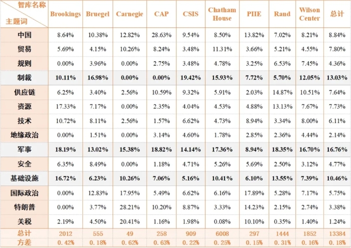 2024年美歐高端智庫(kù)報(bào)告分析(下篇) ——基于13384篇報(bào)告的大數(shù)據(jù)分析 王一童 柴亞超 童天樂 一、研究背景 2024年下半年,全球政治經(jīng)濟(jì)局勢(shì)呈現(xiàn)出穩(wěn)中求變、變中求進(jìn)的復(fù)雜調(diào)整態(tài)勢(shì),盡管面臨多重挑戰(zhàn),但2024年全球經(jīng)濟(jì)繼續(xù)緩慢復(fù)蘇,制造業(yè)景氣度逐步修復(fù),通脹壓力有所緩解,國(guó)際貿(mào)易呈現(xiàn)回升跡象。與此同時(shí),全球正經(jīng)歷以數(shù)字化、人工智能為驅(qū)動(dòng)的深刻變革,新興技術(shù)加速重構(gòu)產(chǎn)業(yè)格局,清潔能源產(chǎn)業(yè)鏈和關(guān)鍵礦產(chǎn)資源成為大國(guó)戰(zhàn)略博弈的新焦點(diǎn)。在應(yīng)對(duì)氣候變化背景下,各國(guó)加速推進(jìn)能源轉(zhuǎn)型,由于不可再生能源產(chǎn)業(yè)鏈和供應(yīng)鏈安全問題日益凸顯,美歐國(guó)家力圖通過立法和政策強(qiáng)化關(guān)鍵礦產(chǎn)本土化戰(zhàn)略,圍繞鋰、鈷等戰(zhàn)略性資源展開激烈競(jìng)爭(zhēng)。 在錯(cuò)綜復(fù)雜的國(guó)際形勢(shì)中,深入分析和準(zhǔn)確判斷當(dāng)前和今后一個(gè)時(shí)期國(guó)際形勢(shì)的基本特征和演變趨勢(shì),有助于我們準(zhǔn)確把握先機(jī)、掌握戰(zhàn)略主動(dòng)、有效應(yīng)對(duì)風(fēng)險(xiǎn)。美歐智庫(kù)憑借深厚研究積淀和廣泛影響力,其政策分析報(bào)告已成為透視政府決策邏輯和社會(huì)輿情的重要窗口。值得注意的是,全球經(jīng)濟(jì)復(fù)蘇仍存在區(qū)域不平衡,亞洲制造業(yè)采購(gòu)經(jīng)理指數(shù)(PMI)持續(xù)擴(kuò)張而歐美呈現(xiàn)疲軟態(tài)勢(shì),疊加地緣政治沖突和貿(mào)易保護(hù)主義因素,經(jīng)濟(jì)溫和復(fù)蘇中波動(dòng)風(fēng)險(xiǎn)顯著。面對(duì)多極化趨勢(shì)深化和產(chǎn)業(yè)鏈重構(gòu),加強(qiáng)國(guó)際合作與結(jié)構(gòu)性改革成為各國(guó)應(yīng)對(duì)挑戰(zhàn)的共同選擇。在此背景下,統(tǒng)籌把握技術(shù)創(chuàng)新、資源安全與全球治理之間的互動(dòng)關(guān)系,對(duì)實(shí)現(xiàn)我國(guó)可持續(xù)發(fā)展具有關(guān)鍵意義。 2022年以來,中咨公司持續(xù)跟蹤美歐智庫(kù)研究動(dòng)向,對(duì)美歐智庫(kù)全量報(bào)告文本進(jìn)行大數(shù)據(jù)分析,本報(bào)告屬于美歐智庫(kù)成果大數(shù)據(jù)研究系列。全面了解美歐國(guó)家對(duì)國(guó)際政治、經(jīng)濟(jì)貿(mào)易、中國(guó)發(fā)展等關(guān)鍵領(lǐng)域的認(rèn)知情況,可助力我國(guó)政府決策部門及時(shí)研判美歐國(guó)家對(duì)我國(guó)的政策戰(zhàn)略意圖,結(jié)合國(guó)內(nèi)實(shí)際情況制定應(yīng)對(duì)策略,提升我國(guó)信息情報(bào)領(lǐng)域的決策參考服務(wù)水平。 二、樣本選取 研究樣本選取美國(guó)布魯金斯學(xué)會(huì)(Brookings.Brookings Institution)、美國(guó)卡內(nèi)基國(guó)際和平基金會(huì)(Carnegie.Carnegie Endowment for lnternational Peace)、比利時(shí)布魯蓋爾研究所(Bruegel)、美國(guó)戰(zhàn)略與國(guó)際問題研究中心(CSIS.Center for Strategic and International Studies)、英國(guó)皇家國(guó)際事務(wù)研究所(The Royal Institute of International Affairs,又稱查塔姆社:Chatham House)、美國(guó)蘭德公司(Rand)、美國(guó)彼得森國(guó)際經(jīng)濟(jì)研究所(PIIE.Peterson Institute for International Economics )、伍德羅·威爾遜國(guó)際學(xué)者中心(Woodrow Wilson International Center for Scholars,簡(jiǎn)稱威爾遜中心:Wilson Center)和美國(guó)進(jìn)步中心(CAP.Center for American Progress)等9家智庫(kù)。 樣本報(bào)告涵蓋國(guó)際政治、地緣政治、中國(guó)、軍事、科技、安全、貿(mào)易、供應(yīng)鏈、規(guī)則、資源、基礎(chǔ)設(shè)施建設(shè)、特朗普、制裁等相關(guān)關(guān)鍵詞的研究報(bào)告,共計(jì)13384篇。 三、文本數(shù)據(jù)分析 (一)各智庫(kù)關(guān)注領(lǐng)域 據(jù)統(tǒng)計(jì),2024年下半年,美歐智庫(kù)中聚焦安全、科技、國(guó)際政治等議題的研究報(bào)告占比在五分之二左右;聚焦中國(guó)、資源、制裁等議題的研究報(bào)告占比在四分之一左右;聚焦貿(mào)易、規(guī)則、軍事、地緣政治等議題的研究報(bào)告約占五分之一;聚焦基礎(chǔ)設(shè)施建設(shè)、相關(guān)供應(yīng)鏈、特朗普政府、對(duì)等關(guān)稅等議題的研究報(bào)告約占八分之一。 1.威爾遜中心 威爾遜中心聚焦國(guó)際政治與規(guī)則研究,指出在全球技術(shù)競(jìng)爭(zhēng)深化的當(dāng)下,美國(guó)需構(gòu)建強(qiáng)有力的技術(shù)聯(lián)盟以鞏固競(jìng)爭(zhēng)力。威爾遜中心認(rèn)為當(dāng)前技術(shù)競(jìng)爭(zhēng)已成為國(guó)家安全與經(jīng)濟(jì)安全的核心議題,面對(duì)中國(guó)等國(guó)家的挑戰(zhàn),美國(guó)必須通過聯(lián)盟機(jī)制整合資源。這種協(xié)作不僅能推動(dòng)技術(shù)創(chuàng)新,更可以在關(guān)鍵領(lǐng)域形成協(xié)同合力,有效應(yīng)對(duì)包含網(wǎng)絡(luò)安全、氣候變化、經(jīng)濟(jì)不平等在內(nèi)的全球性挑戰(zhàn)。通過共享最佳實(shí)踐與優(yōu)化資源配置,美國(guó)得以在國(guó)際舞臺(tái)上維護(hù)技術(shù)領(lǐng)導(dǎo)地位,實(shí)現(xiàn)戰(zhàn)略目標(biāo)